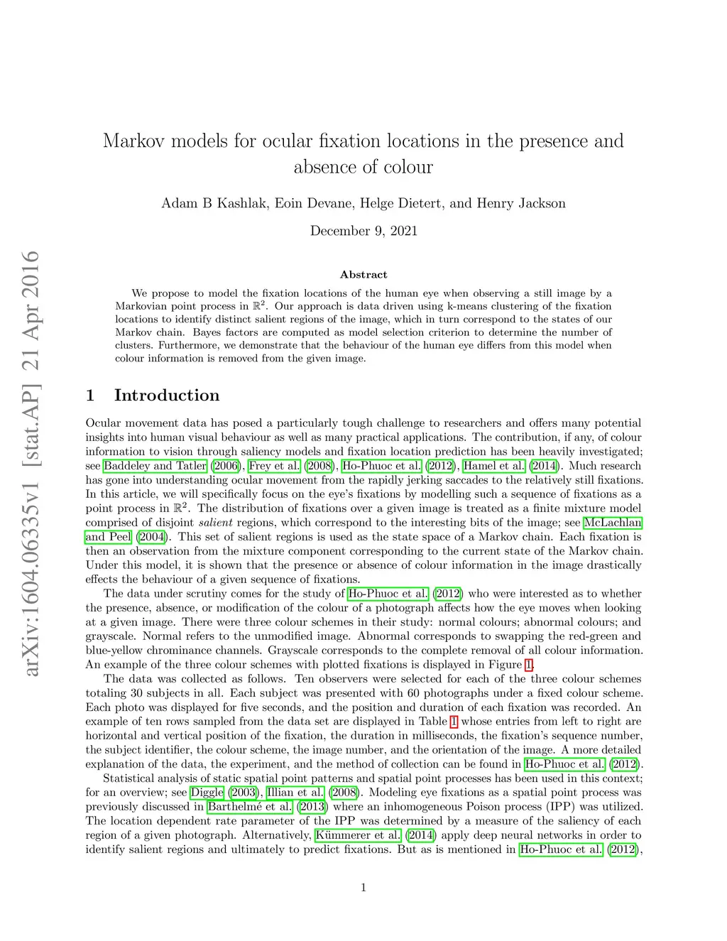 We propose to model the fixation locations of the human eye when observing a still image by a Markovian point process in R 2 . Our approach is data driven using k-means clustering of the fixation locations to identify distinct salient regions of the image, which in turn correspond to the states of our Markov chain. Bayes factors are computed as model selection criterion to determine the number of clusters. Furthermore, we demonstrate that the behaviour of the human eye differs from this model when colour information is removed from the given image.