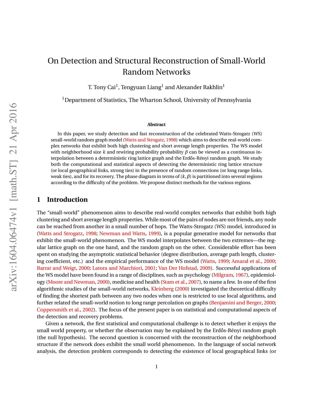 In this paper, we study detection and fast reconstruction of the celebrated Watts-Strogatz (WS) small-world random graph model \citep{watts1998collective} which aims to describe real-world complex networks that exhibit both high clustering and short average length properties. The WS model with neighborhood size and rewiring probability probability can be viewed as a continuous interpolation between a deterministic ring lattice graph and the Erd\H{o}s-R\'{e}nyi random graph. We study both the computational and statistical aspects of detecting the deterministic ring lattice structure (or local geographical links, strong ties) in the presence of random connections (or long range links, weak ties), and for its recovery. The phase diagram in terms of is partitioned into several regions according to the difficulty of the problem. We propose distinct methods for the various regions.