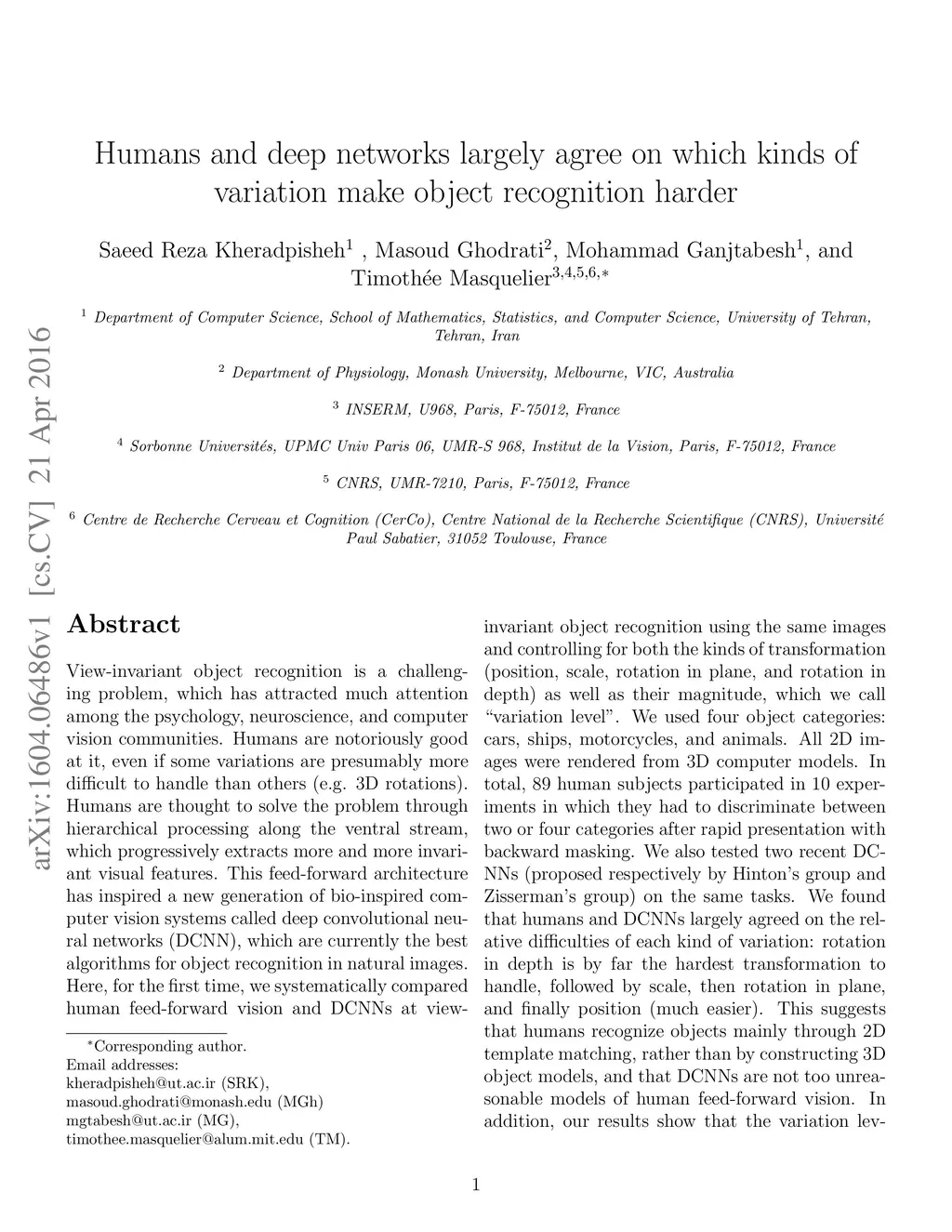 View-invariant object recognition is a challenging problem, which has attracted much attention among the psychology, neuroscience, and computer vision communities. Humans are notoriously good at it, even if some variations are presumably more difficult to handle than others (e.g. 3D rotations). Humans are thought to solve the problem through hierarchical processing along the ventral stream, which progressively extracts more and more invariant visual features. This feed-forward architecture has inspired a new generation of bio-inspired computer vision systems called deep convolutional neural networks (DCNN), which are currently the best algorithms for object recognition in natural images. Here, for the first time, we systematically compared human feed-forward vision and DCNNs at view-invariant object recognition using the same images and controlling for both the kinds of transformation as well as their magnitude. We used four object categories and images were rendered from 3D computer models. In total, 89 human subjects participated in 10 experiments in which they had to discriminate between two or four categories after rapid presentation with backward masking. We also tested two recent DCNNs on the same tasks. We found that humans and DCNNs largely agreed on the relative difficulties of each kind of variation: rotation in depth is by far the hardest transformation to handle, followed by scale, then rotation in plane, and finally position. This suggests that humans recognize objects mainly through 2D template matching, rather than by constructing 3D object models, and that DCNNs are not too unreasonable models of human feed-forward vision. Also, our results show that the variation levels in rotation in depth and scale strongly modulate both humans' and DCNNs' recognition performances. We thus argue that these variations should be controlled in the image datasets used in vision research.