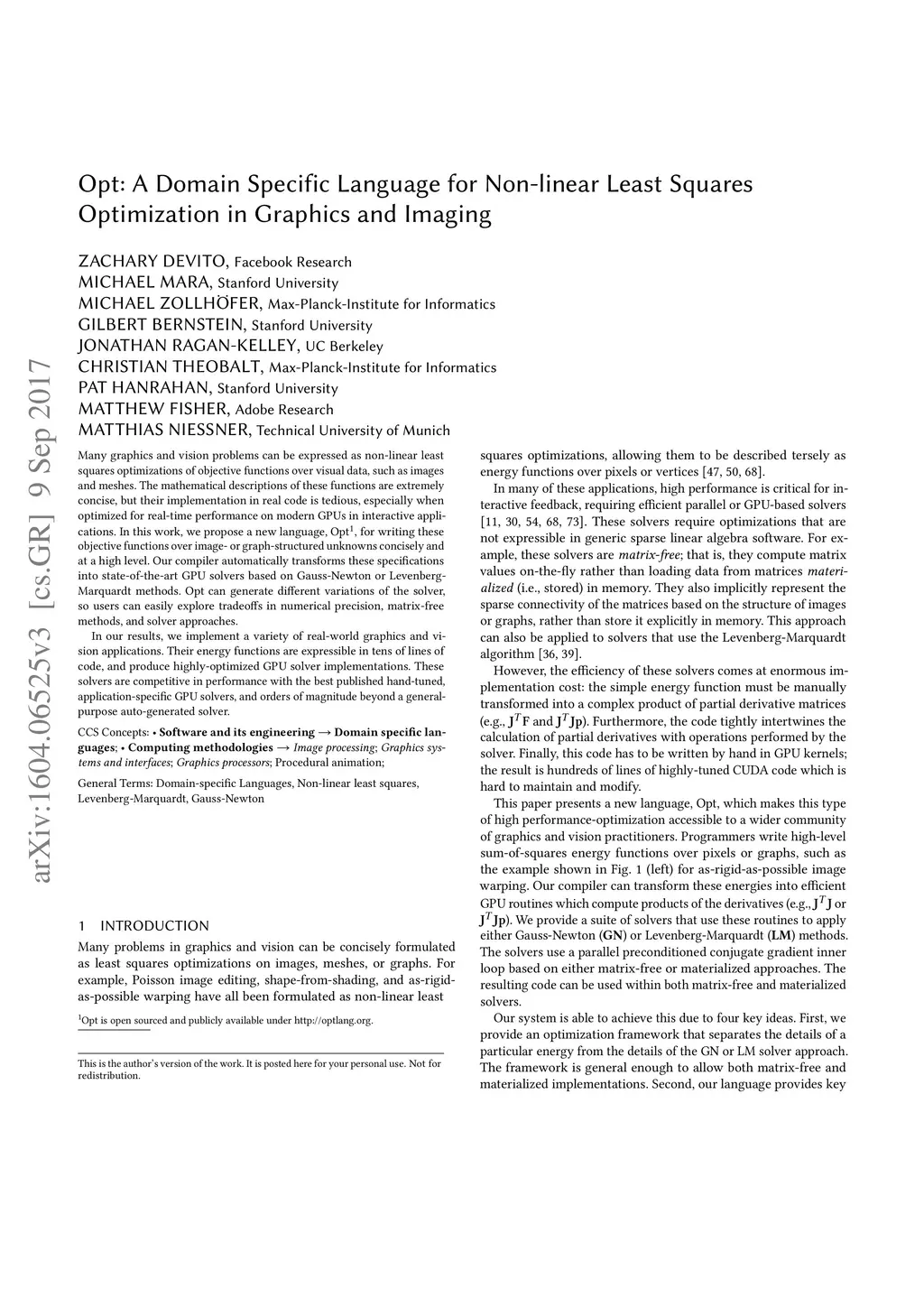Many graphics and vision problems can be expressed as non-linear least squares optimizations of objective functions over visual data, such as images and meshes. The mathematical descriptions of these functions are extremely concise, but their implementation in real code is tedious, especially when optimized for real-time performance on modern GPUs in interactive applications. In this work, we propose a new language, Opt (available under http://optlang.org), for writing these objective functions over image- or graph-structured unknowns concisely and at a high level. Our compiler automatically transforms these specifications into state-of-the-art GPU solvers based on Gauss-Newton or Levenberg-Marquardt methods. Opt can generate different variations of the solver, so users can easily explore tradeoffs in numerical precision, matrix-free methods, and solver approaches. In our results, we implement a variety of real-world graphics and vision applications. Their energy functions are expressible in tens of lines of code, and produce highly-optimized GPU solver implementations. These solver have performance competitive with the best published hand-tuned, application-specific GPU solvers, and orders of magnitude beyond a general-purpose auto-generated solver.