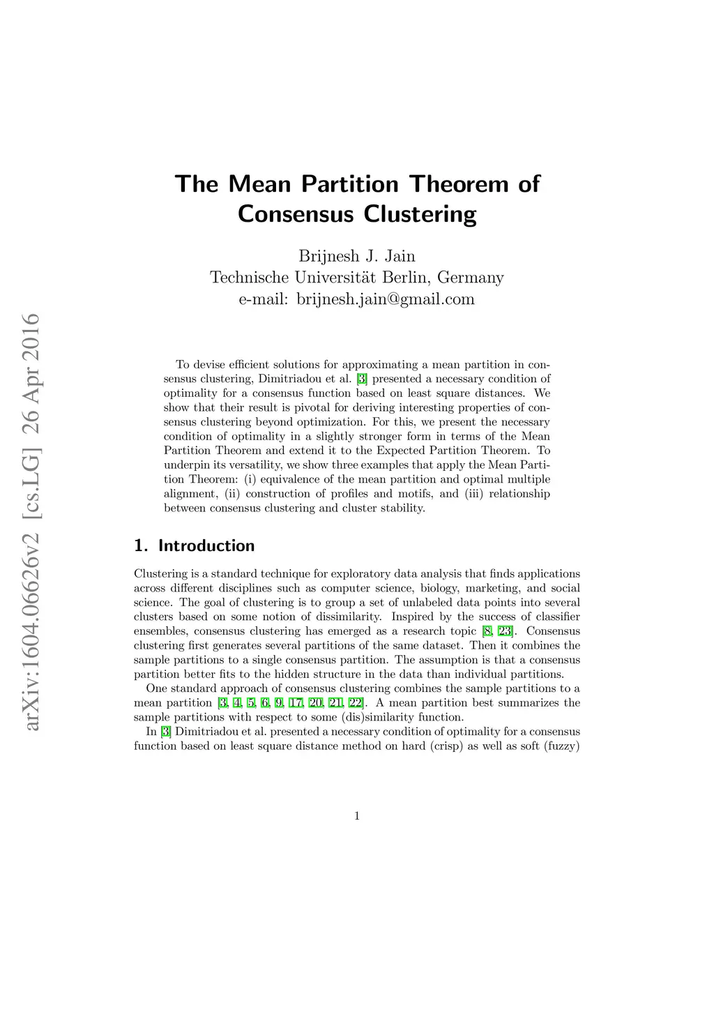 To devise efficient solutions for approximating a mean partition in consensus clustering, Dimitriadou et al. [3] presented a necessary condition of optimality for a consensus function based on least square distances. We show that their result is pivotal for deriving interesting properties of consensus clustering beyond optimization. For this, we present the necessary condition of optimality in a slightly stronger form in terms of the Mean Partition Theorem and extend it to the Expected Partition Theorem. To underpin its versatility, we show three examples that apply the Mean Partition Theorem: (i) equivalence of the mean partition and optimal multiple alignment, (ii) construction of profiles and motifs, and (iii) relationship between consensus clustering and cluster stability.