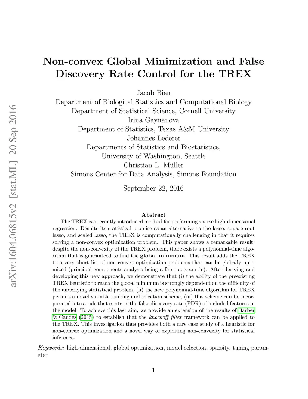 The TREX is a recently introduced method for performing sparse high-dimensional regression. Despite its statistical promise as an alternative to the lasso, square-root lasso, and scaled lasso, the TREX is computationally challenging in that it requires solving a non-convex optimization problem. This paper shows a remarkable result: despite the non-convexity of the TREX problem, there exists a polynomial-time algorithm that is guaranteed to find the global minimum. This result adds the TREX to a very short list of non-convex optimization problems that can be globally optimized (principal components analysis being a famous example). After deriving and developing this new approach, we demonstrate that (i) the ability of the preexisting TREX heuristic to reach the global minimum is strongly dependent on the difficulty of the underlying statistical problem, (ii) the new polynomial-time algorithm for TREX permits a novel variable ranking and selection scheme, (iii) this scheme can be incorporated into a rule that controls the false discovery rate (FDR) of included features in the model. To achieve this last aim, we provide an extension of the results of Barber & Candes (2015) to establish that the knockoff filter framework can be applied to the TREX. This investigation thus provides both a rare case study of a heuristic for non-convex optimization and a novel way of exploiting non-convexity for statistical inference.