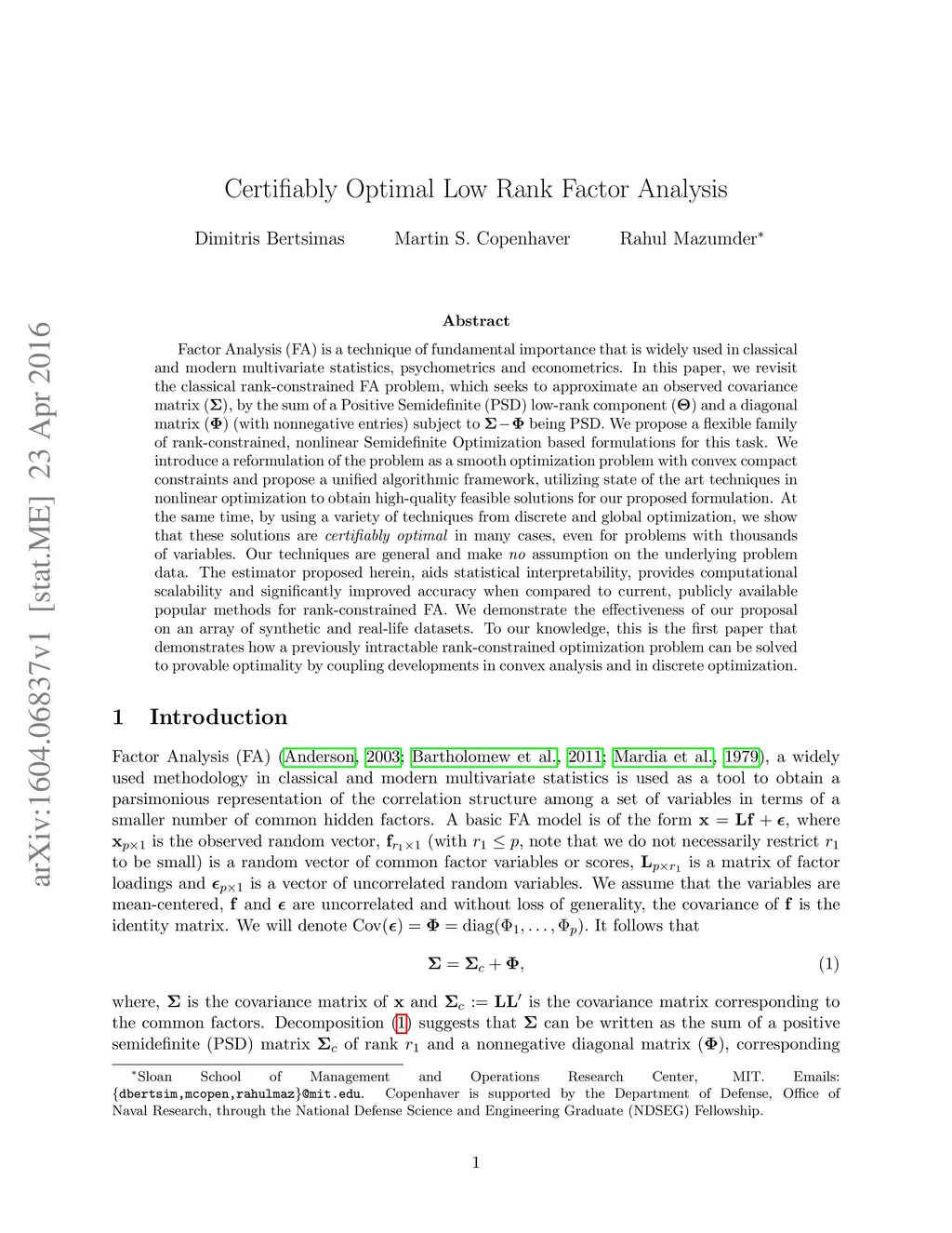 Factor Analysis (FA) is a technique of fundamental importance that is widely used in classical and modern multivariate statistics, psychometrics and econometrics. In this paper, we revisit the classical rank-constrained FA problem, which seeks to approximate an observed covariance matrix (), by the sum of a Positive Semidefinite (PSD) low-rank component () and a diagonal matrix () (with nonnegative entries) subject to being PSD. We propose a flexible family of rank-constrained, nonlinear Semidefinite Optimization based formulations for this task. We introduce a reformulation of the problem as a smooth optimization problem with convex compact constraints and propose a unified algorithmic framework, utilizing state of the art techniques in nonlinear optimization to obtain high-quality feasible solutions for our proposed formulation. At the same time, by using a variety of techniques from discrete and global optimization, we show that these solutions are certifiably optimal in many cases, even for problems with thousands of variables. Our techniques are general and make no assumption on the underlying problem data. The estimator proposed herein, aids statistical interpretability, provides computational scalability and significantly improved accuracy when compared to current, publicly available popular methods for rank-constrained FA. We demonstrate the effectiveness of our proposal on an array of synthetic and real-life datasets. To our knowledge, this is the first paper that demonstrates how a previously intractable rank-constrained optimization problem can be solved to provable optimality by coupling developments in convex analysis and in discrete optimization.