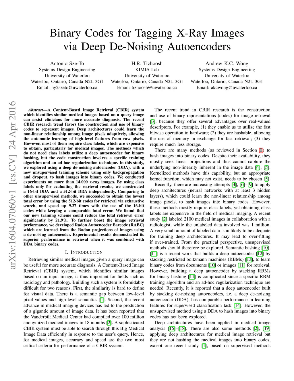 A Content-Based Image Retrieval (CBIR) system which identifies similar medical images based on a query image can assist clinicians for more accurate diagnosis. The recent CBIR research trend favors the construction and use of binary codes to represent images. Deep architectures could learn the non-linear relationship among image pixels adaptively, allowing the automatic learning of high-level features from raw pixels. However, most of them require class labels, which are expensive to obtain, particularly for medical images. The methods which do not need class labels utilize a deep autoencoder for binary hashing, but the code construction involves a specific training algorithm and an ad-hoc regularization technique. In this study, we explored using a deep de-noising autoencoder (DDA), with a new unsupervised training scheme using only backpropagation and dropout, to hash images into binary codes. We conducted experiments on more than 14,000 x-ray images. By using class labels only for evaluating the retrieval results, we constructed a 16-bit DDA and a 512-bit DDA independently. Comparing to other unsupervised methods, we succeeded to obtain the lowest total error by using the 512-bit codes for retrieval via exhaustive search, and speed up 9.27 times with the use of the 16-bit codes while keeping a comparable total error. We found that our new training scheme could reduce the total retrieval error significantly by 21.9%. To further boost the image retrieval performance, we developed Radon Autoencoder Barcode (RABC) which are learned from the Radon projections of images using a de-noising autoencoder. Experimental results demonstrated its superior performance in retrieval when it was combined with DDA binary codes.