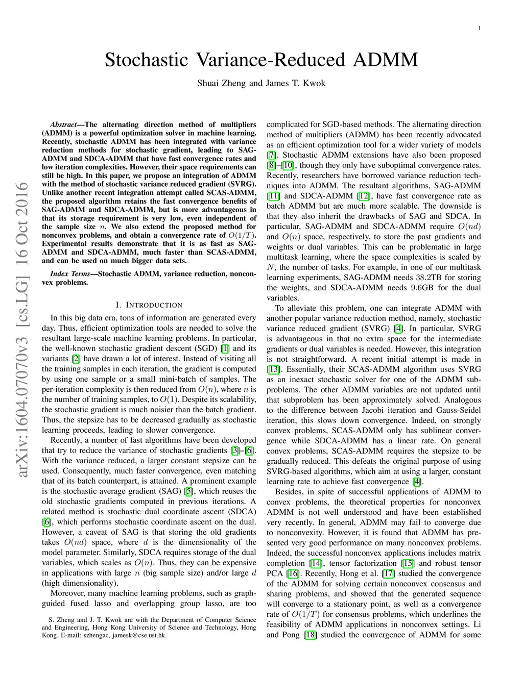 The alternating direction method of multipliers (ADMM) is a powerful optimization solver in machine learning. Recently, stochastic ADMM has been integrated with variance reduction methods for stochastic gradient, leading to SAG-ADMM and SDCA-ADMM that have fast convergence rates and low iteration complexities. However, their space requirements can still be high. In this paper, we propose an integration of ADMM with the method of stochastic variance reduced gradient (SVRG). Unlike another recent integration attempt called SCAS-ADMM, the proposed algorithm retains the fast convergence benefits of SAG-ADMM and SDCA-ADMM, but is more advantageous in that its storage requirement is very low, even independent of the sample size . We also extend the proposed method for nonconvex problems, and obtain a convergence rate of . Experimental results demonstrate that it is as fast as SAG-ADMM and SDCA-ADMM, much faster than SCAS-ADMM, and can be used on much bigger data sets.