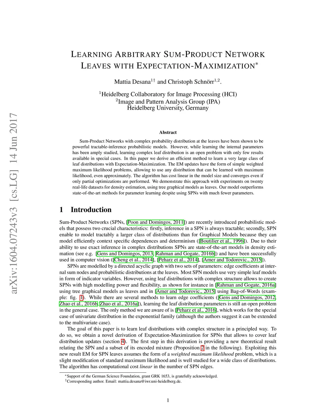Sum-Product Networks with complex probability distribution at the leaves have been shown to be powerful tractable-inference probabilistic models. However, while learning the internal parameters has been amply studied, learning complex leaf distribution is an open problem with only few results available in special cases. In this paper we derive an efficient method to learn a very large class of leaf distributions with Expectation-Maximization. The EM updates have the form of simple weighted maximum likelihood problems, allowing to use any distribution that can be learned with maximum likelihood, even approximately. The algorithm has cost linear in the model size and converges even if only partial optimizations are performed. We demonstrate this approach with experiments on twenty real-life datasets for density estimation, using tree graphical models as leaves. Our model outperforms state-of-the-art methods for parameter learning despite using SPNs with much fewer parameters.