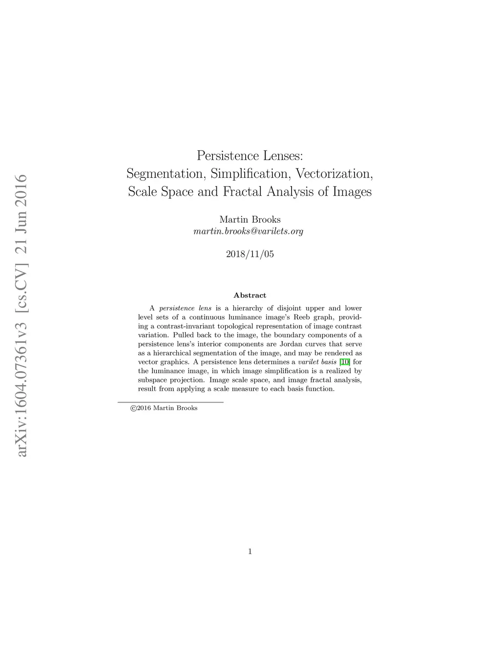 A persistence lens is a hierarchy of disjoint upper and lower level sets of a continuous luminance image's Reeb graph. The boundary components of a persistence lens's interior components are Jordan curves that serve as a hierarchical segmentation of the image, and may be rendered as vector graphics. A persistence lens determines a varilet basis for the luminance image, in which image simplification is a realized by subspace projection. Image scale space, and image fractal analysis, result from applying a scale measure to each basis function.