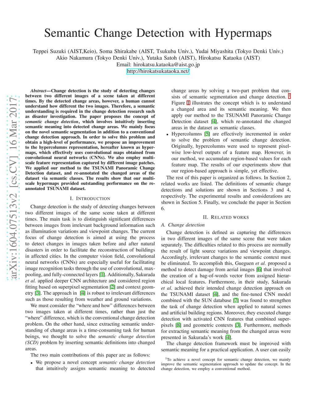 Change detection is the study of detecting changes between two different images of a scene taken at different times. By the detected change areas, however, a human cannot understand how different the two images. Therefore, a semantic understanding is required in the change detection research such as disaster investigation. The paper proposes the concept of semantic change detection, which involves intuitively inserting semantic meaning into detected change areas. We mainly focus on the novel semantic segmentation in addition to a conventional change detection approach. In order to solve this problem and obtain a high-level of performance, we propose an improvement to the hypercolumns representation, hereafter known as hypermaps, which effectively uses convolutional maps obtained from convolutional neural networks (CNNs). We also employ multi-scale feature representation captured by different image patches. We applied our method to the TSUNAMI Panoramic Change Detection dataset, and re-annotated the changed areas of the dataset via semantic classes. The results show that our multi-scale hypermaps provided outstanding performance on the re-annotated TSUNAMI dataset.