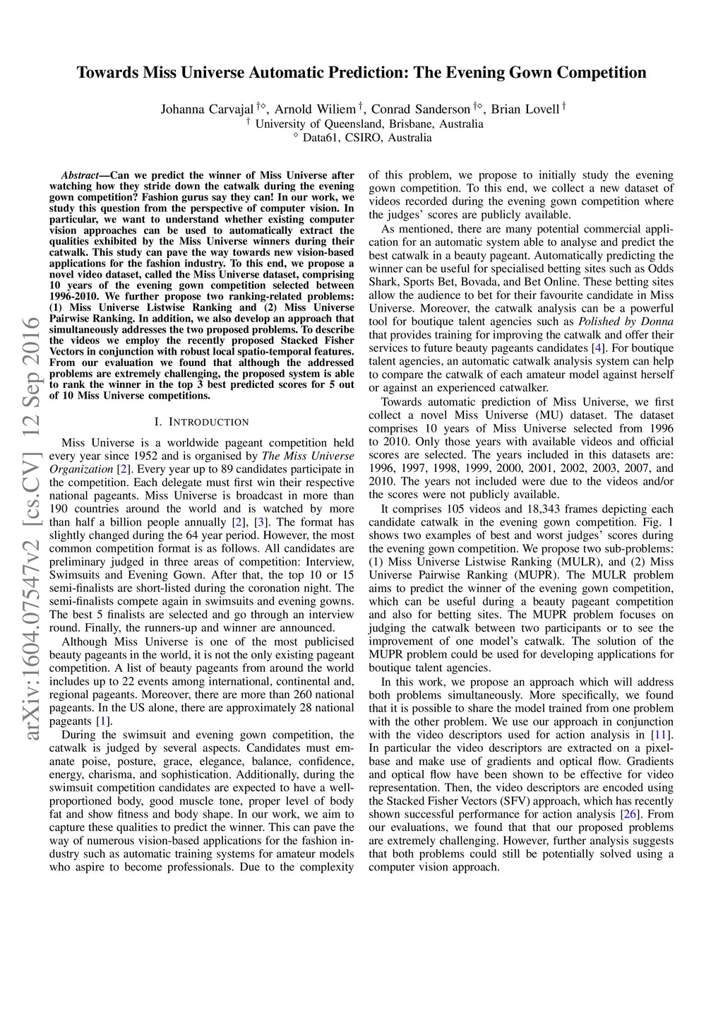 Can we predict the winner of Miss Universe after watching how they stride down the catwalk during the evening gown competition? Fashion gurus say they can! In our work, we study this question from the perspective of computer vision. In particular, we want to understand whether existing computer vision approaches can be used to automatically extract the qualities exhibited by the Miss Universe winners during their catwalk. This study can pave the way towards new vision-based applications for the fashion industry. To this end, we propose a novel video dataset, called the Miss Universe dataset, comprising 10 years of the evening gown competition selected between 1996-2010. We further propose two ranking-related problems: (1) Miss Universe Listwise Ranking and (2) Miss Universe Pairwise Ranking. In addition, we also develop an approach that simultaneously addresses the two proposed problems. To describe the videos we employ the recently proposed Stacked Fisher Vectors in conjunction with robust local spatio-temporal features. From our evaluation we found that although the addressed problems are extremely challenging, the proposed system is able to rank the winner in the top 3 best predicted scores for 5 out of 10 Miss Universe competitions.