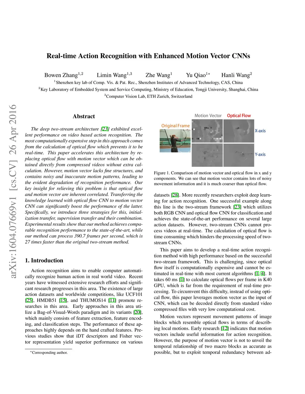 The deep two-stream architecture exhibited excellent performance on video based action recognition. The most computationally expensive step in this approach comes from the calculation of optical flow which prevents it to be real-time. This paper accelerates this architecture by replacing optical flow with motion vector which can be obtained directly from compressed videos without extra calculation. However, motion vector lacks fine structures, and contains noisy and inaccurate motion patterns, leading to the evident degradation of recognition performance. Our key insight for relieving this problem is that optical flow and motion vector are inherent correlated. Transferring the knowledge learned with optical flow CNN to motion vector CNN can significantly boost the performance of the latter. Specifically, we introduce three strategies for this, initialization transfer, supervision transfer and their combination. Experimental results show that our method achieves comparable recognition performance to the state-of-the-art, while our method can process 390.7 frames per second, which is 27 times faster than the original two-stream method.