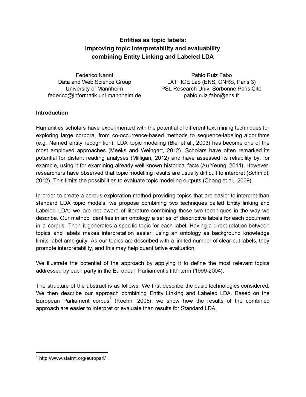 In order to create a corpus exploration method providing topics that are easier to interpret than standard LDA topic models, here we propose combining two techniques called Entity linking and Labeled LDA. Our method identifies in an ontology a series of descriptive labels for each document in a corpus. Then it generates a specific topic for each label. Having a direct relation between topics and labels makes interpretation easier; using an ontology as background knowledge limits label ambiguity. As our topics are described with a limited number of clear-cut labels, they promote interpretability, and this may help quantitative evaluation. We illustrate the potential of the approach by applying it in order to define the most relevant topics addressed by each party in the European Parliament's fifth mandate (1999-2004).