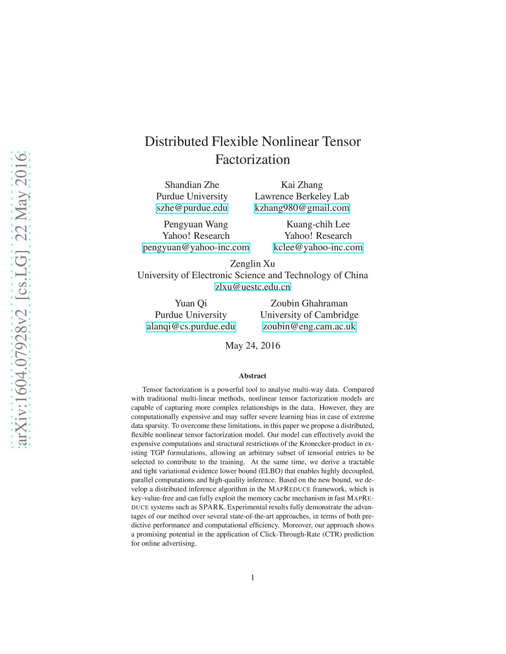 Tensor factorization is a powerful tool to analyse multi-way data. Compared with traditional multi-linear methods, nonlinear tensor factorization models are capable of capturing more complex relationships in the data. However, they are computationally expensive and may suffer severe learning bias in case of extreme data sparsity. To overcome these limitations, in this paper we propose a distributed, flexible nonlinear tensor factorization model. Our model can effectively avoid the expensive computations and structural restrictions of the Kronecker-product in existing TGP formulations, allowing an arbitrary subset of tensorial entries to be selected to contribute to the training. At the same time, we derive a tractable and tight variational evidence lower bound (ELBO) that enables highly decoupled, parallel computations and high-quality inference. Based on the new bound, we develop a distributed inference algorithm in the MapReduce framework, which is key-value-free and can fully exploit the memory cache mechanism in fast MapReduce systems such as SPARK. Experimental results fully demonstrate the advantages of our method over several state-of-the-art approaches, in terms of both predictive performance and computational efficiency. Moreover, our approach shows a promising potential in the application of Click-Through-Rate (CTR) prediction for online advertising.