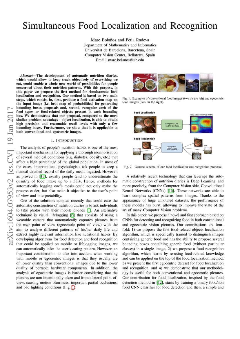 The development of automatic nutrition diaries, which would allow to keep track objectively of everything we eat, could enable a whole new world of possibilities for people concerned about their nutrition patterns. With this purpose, in this paper we propose the first method for simultaneous food localization and recognition. Our method is based on two main steps, which consist in, first, produce a food activation map on the input image (i.e. heat map of probabilities) for generating bounding boxes proposals and, second, recognize each of the food types or food-related objects present in each bounding box. We demonstrate that our proposal, compared to the most similar problem nowadays - object localization, is able to obtain high precision and reasonable recall levels with only a few bounding boxes. Furthermore, we show that it is applicable to both conventional and egocentric images.