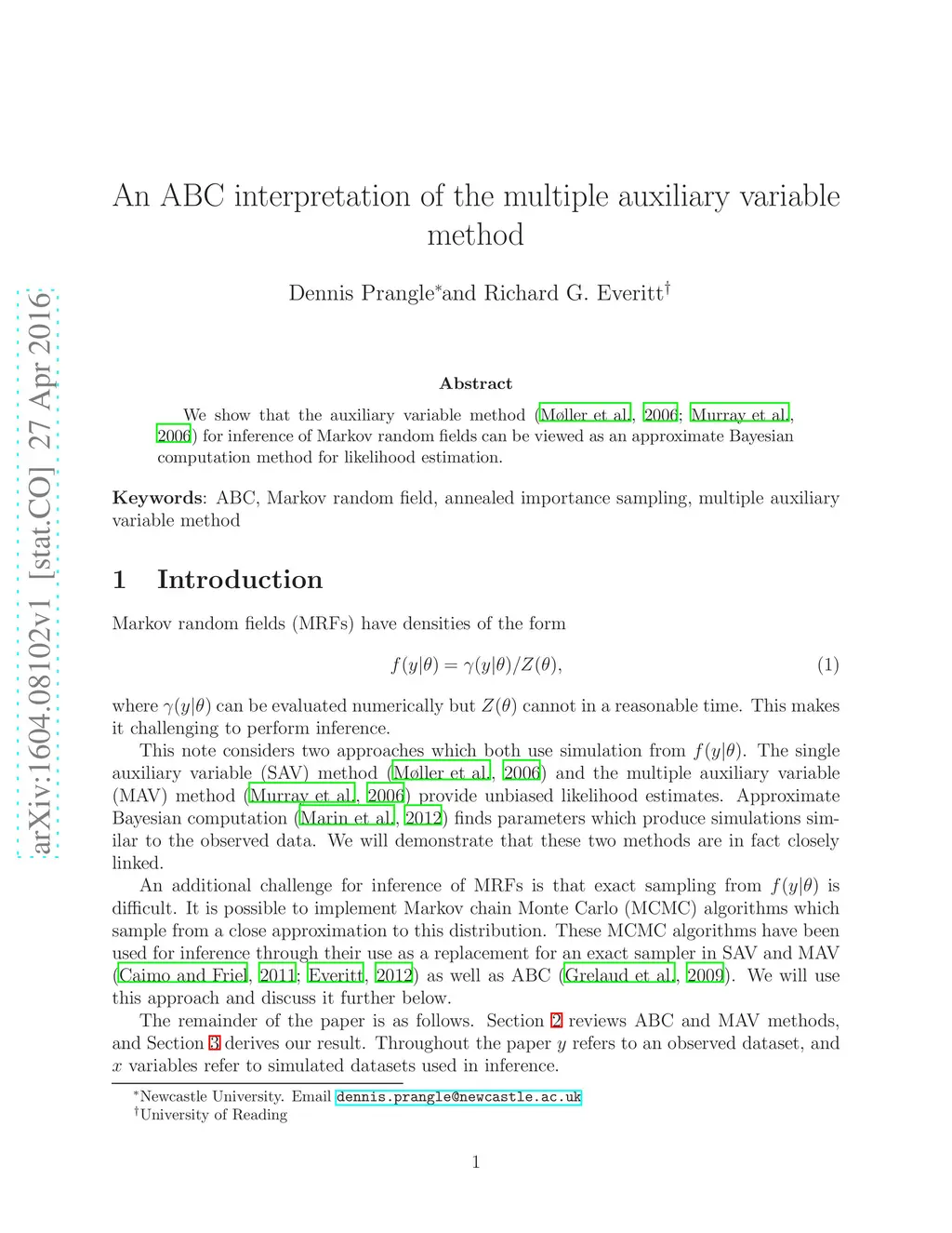 We show that the auxiliary variable method (M{\o}ller et al., 2006; Murray et al., 2006) for inference of Markov random fields can be viewed as an approximate Bayesian computation method for likelihood estimation.