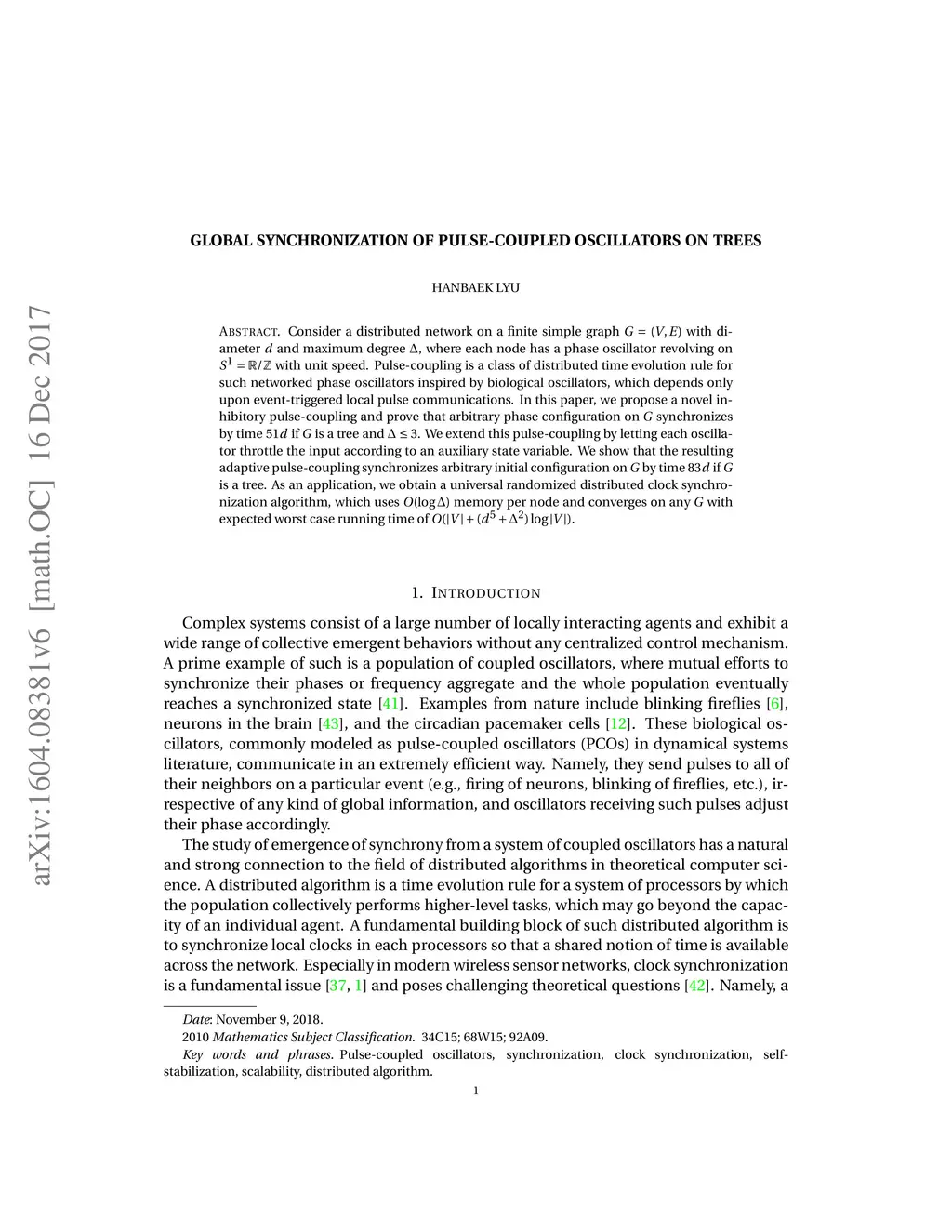 Consider a distributed network on a finite simple graph with diameter and maximum degree , where each node has a phase oscillator revolving on with unit speed. Pulse-coupling is a class of distributed time evolution rule for such networked phase oscillators inspired by biological oscillators, which depends only upon event-triggered local pulse communications. In this paper, we propose a novel inhibitory pulse-coupling and prove that arbitrary phase configuration on synchronizes by time if is a tree and . We extend this pulse-coupling by letting each oscillator throttle the input according to an auxiliary state variable. We show that the resulting adaptive pulse-coupling synchronizes arbitrary initial configuration on by time if is a tree. As an application, we obtain a universal randomized distributed clock synchronization algorithm, which uses memory per node and converges on any with expected worst case running time of .
