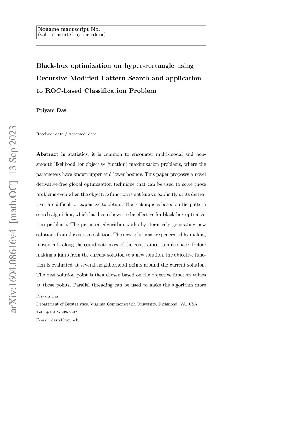 In statistics, it is common to encounter multi-modal and non-smooth likelihood (or objective function) maximization problems, where the parameters have known upper and lower bounds. This paper proposes a novel derivative-free global optimization technique that can be used to solve those problems even when the objective function is not known explicitly or its derivatives are difficult or expensive to obtain. The technique is based on the pattern search algorithm, which has been shown to be effective for black-box optimization problems. The proposed algorithm works by iteratively generating new solutions from the current solution. The new solutions are generated by making movements along the coordinate axes of the constrained sample space. Before making a jump from the current solution to a new solution, the objective function is evaluated at several neighborhood points around the current solution. The best solution point is then chosen based on the objective function values at those points. Parallel threading can be used to make the algorithm more scalable. The performance of the proposed method is evaluated by optimizing up to 5000-dimensional multi-modal benchmark functions. The proposed algorithm is shown to be up to 40 and 368 times faster than genetic algorithm (GA) and simulated annealing (SA), respectively. The proposed method is also used to estimate the optimal biomarker combination from Alzheimer's disease data by maximizing the empirical estimates of the area under the receiver operating characteristic curve (AUC), outperforming the contextual popular alternative, known as step-down algorithm.