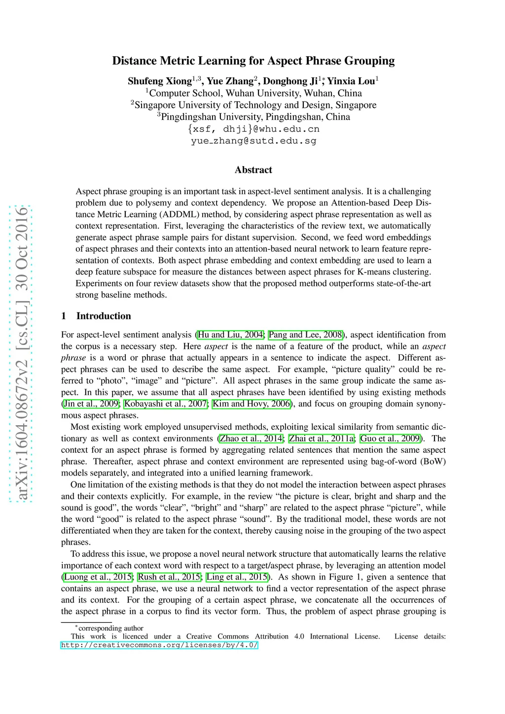 Distance Metric Learning for Aspect Phrase Grouping