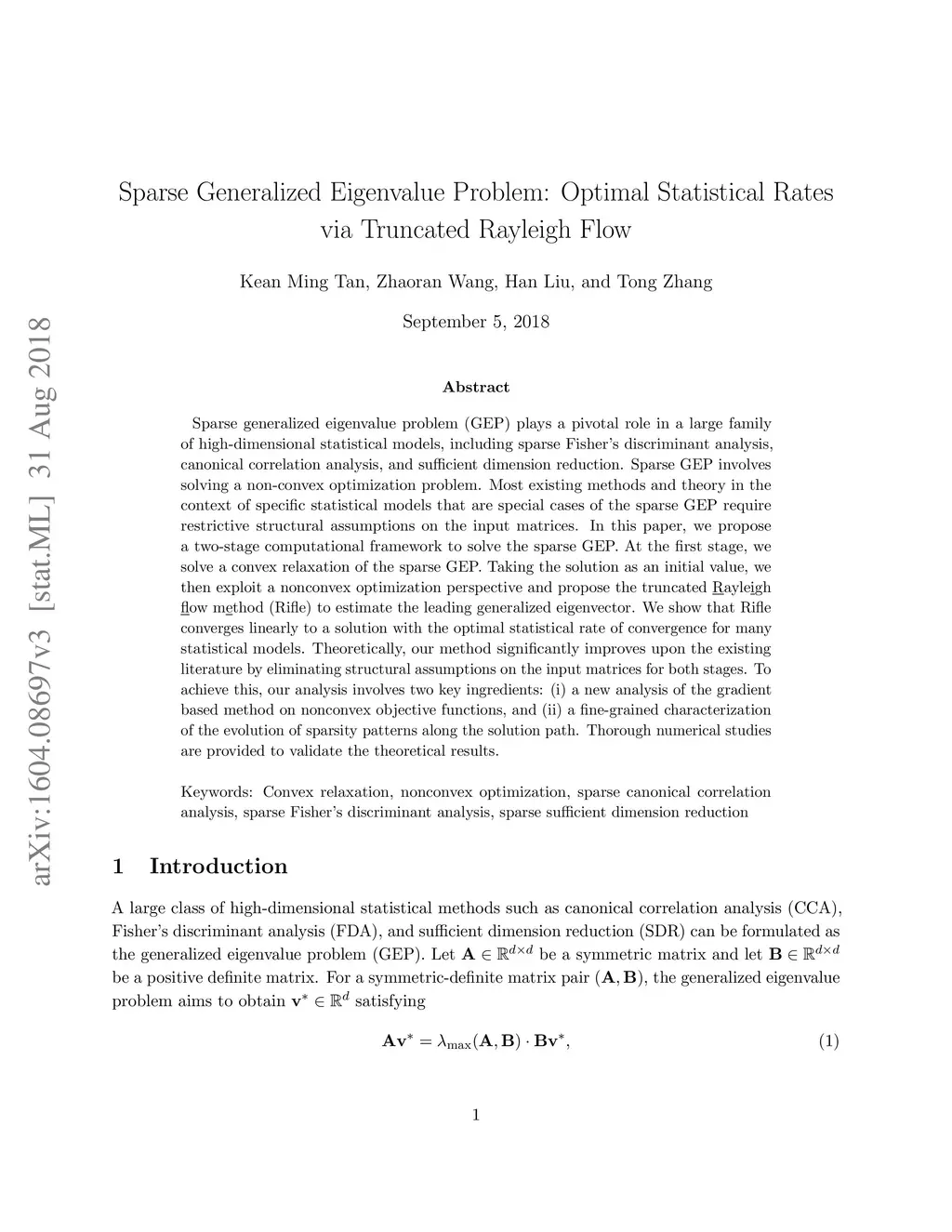 Sparse generalized eigenvalue problem (GEP) plays a pivotal role in a large family of high-dimensional statistical models, including sparse Fisher's discriminant analysis, canonical correlation analysis, and sufficient dimension reduction. Sparse GEP involves solving a non-convex optimization problem. Most existing methods and theory in the context of specific statistical models that are special cases of the sparse GEP require restrictive structural assumptions on the input matrices. In this paper, we propose a two-stage computational framework to solve the sparse GEP. At the first stage, we solve a convex relaxation of the sparse GEP. Taking the solution as an initial value, we then exploit a nonconvex optimization perspective and propose the truncated Rayleigh flow method (Rifle) to estimate the leading generalized eigenvector. We show that Rifle converges linearly to a solution with the optimal statistical rate of convergence for many statistical models. Theoretically, our method significantly improves upon the existing literature by eliminating structural assumptions on the input matrices for both stages. To achieve this, our analysis involves two key ingredients: (i) a new analysis of the gradient based method on nonconvex objective functions, and (ii) a fine-grained characterization of the evolution of sparsity patterns along the solution path. Thorough numerical studies are provided to validate the theoretical results.