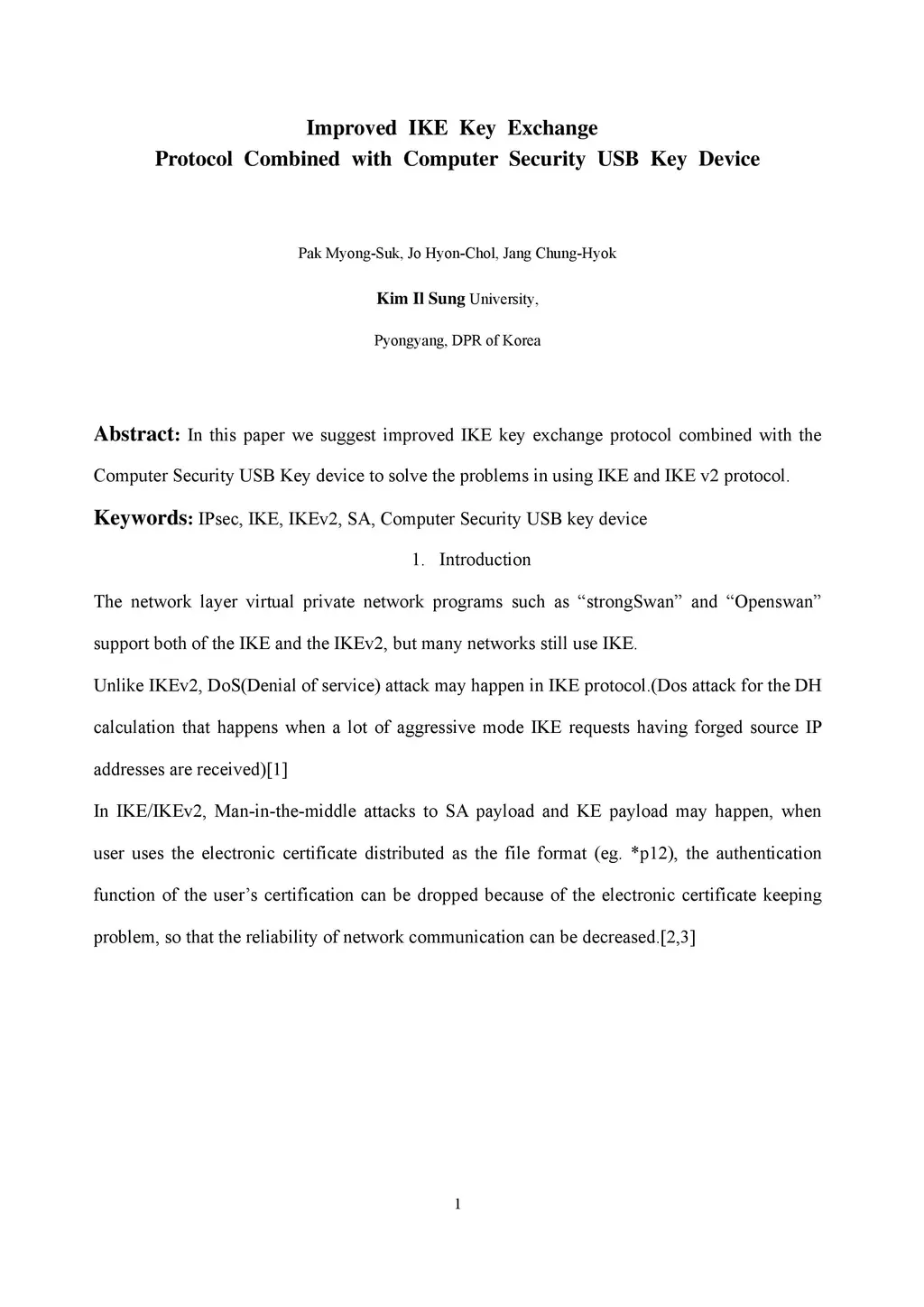 : In this paper we suggest improved IKE key exchange protocol combined with the Computer Security USB Key device to solve the problems in using IKE and IKE v2 protocol.