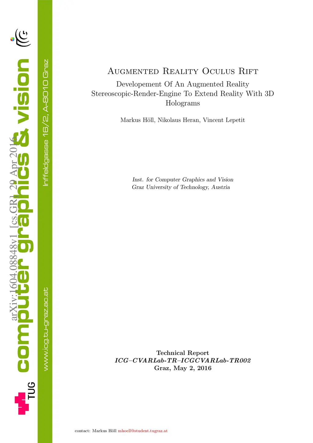 This paper covers the whole process of developing an Augmented Reality Stereoscopig Render Engine for the Oculus Rift. To capture the real world in form of a camera stream, two cameras with fish-eye lenses had to be installed on the Oculus Rift DK1 hardware. The idea was inspired by Steptoe \cite{steptoe2014presence}. After the introduction, a theoretical part covers all the most neccessary elements to achieve an AR System for the Oculus Rift, following the implementation part where the code from the AR Stereo Engine is explained in more detail. A short conclusion section shows some results, reflects some experiences and in the final chapter some future works will be discussed. The project can be accessed via the git repository https://github.com/MaXvanHeLL/ARift.git.