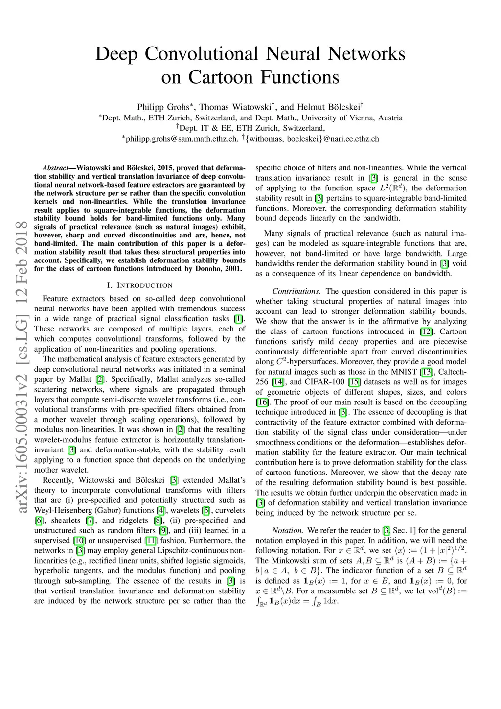 Wiatowski and B\"olcskei, 2015, proved that deformation stability and vertical translation invariance of deep convolutional neural network-based feature extractors are guaranteed by the network structure per se rather than the specific convolution kernels and non-linearities. While the translation invariance result applies to square-integrable functions, the deformation stability bound holds for band-limited functions only. Many signals of practical relevance (such as natural images) exhibit, however, sharp and curved discontinuities and are, hence, not band-limited. The main contribution of this paper is a deformation stability result that takes these structural properties into account. Specifically, we establish deformation stability bounds for the class of cartoon functions introduced by Donoho, 2001.
