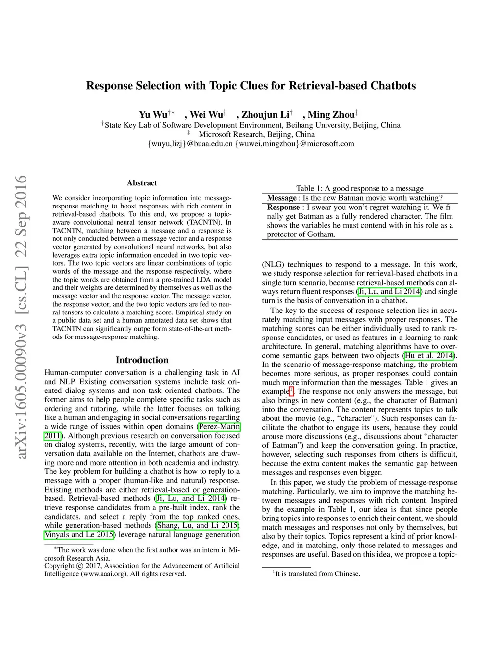 Response Selection with Topic Clues for Retrieval-based Chatbots