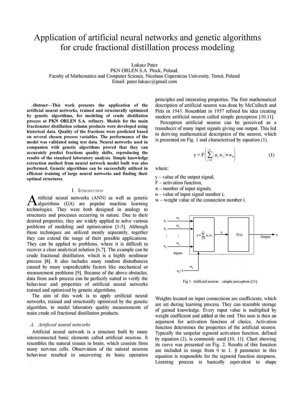 This work presents the application of the artificial neural networks, trained and structurally optimized by genetic algorithms, for modeling of crude distillation process at PKN ORLEN S.A. refinery. Models for the main fractionator distillation column products were developed using historical data. Quality of the fractions were predicted based on several chosen process variables. The performance of the model was validated using test data. Neural networks used in companion with genetic algorithms proved that they can accurately predict fractions quality shifts, reproducing the results of the standard laboratory analysis. Simple knowledge extraction method from neural network model built was also performed. Genetic algorithms can be successfully utilized in efficient training of large neural networks and finding their optimal structures.