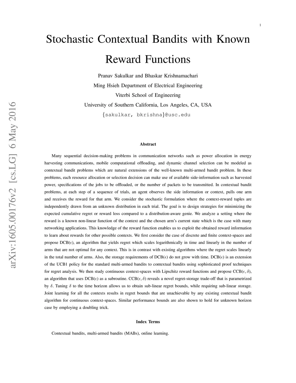 Many sequential decision-making problems in communication networks can be modeled as contextual bandit problems, which are natural extensions of the well-known multi-armed bandit problem. In contextual bandit problems, at each time, an agent observes some side information or context, pulls one arm and receives the reward for that arm. We consider a stochastic formulation where the context-reward tuples are independently drawn from an unknown distribution in each trial. Motivated by networking applications, we analyze a setting where the reward is a known non-linear function of the context and the chosen arm's current state. We first consider the case of discrete and finite context-spaces and propose DCB(), an algorithm that we prove, through a careful analysis, yields regret (cumulative reward gap compared to a distribution-aware genie) scaling logarithmically in time and linearly in the number of arms that are not optimal for any context, improving over existing algorithms where the regret scales linearly in the total number of arms. We then study continuous context-spaces with Lipschitz reward functions and propose CCB(), an algorithm that uses DCB() as a subroutine. CCB() reveals a novel regret-storage trade-off that is parametrized by . Tuning to the time horizon allows us to obtain sub-linear regret bounds, while requiring sub-linear storage. By exploiting joint learning for all contexts we get regret bounds for CCB() that are unachievable by any existing contextual bandit algorithm for continuous context-spaces. We also show similar performance bounds for the unknown horizon case.
