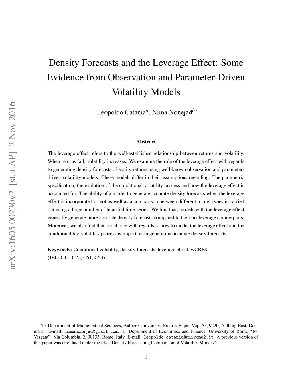 The leverage effect refers to the well-established relationship between returns and volatility. When returns fall, volatility increases. We examine the role of the leverage effect with regards to generating density forecasts of equity returns using well-known observation and parameter-driven volatility models. These models differ in their assumptions regarding: The parametric specification, the evolution of the conditional volatility process and how the leverage effect is accounted for. The ability of a model to generate accurate density forecasts when the leverage effect is incorporated or not as well as a comparison between different model-types is carried out using a large number of financial time-series. We find that, models with the leverage effect generally generate more accurate density forecasts compared to their no-leverage counterparts. Moreover, we also find that our choice with regards to how to model the leverage effect and the conditional log-volatility process is important in generating accurate density forecasts