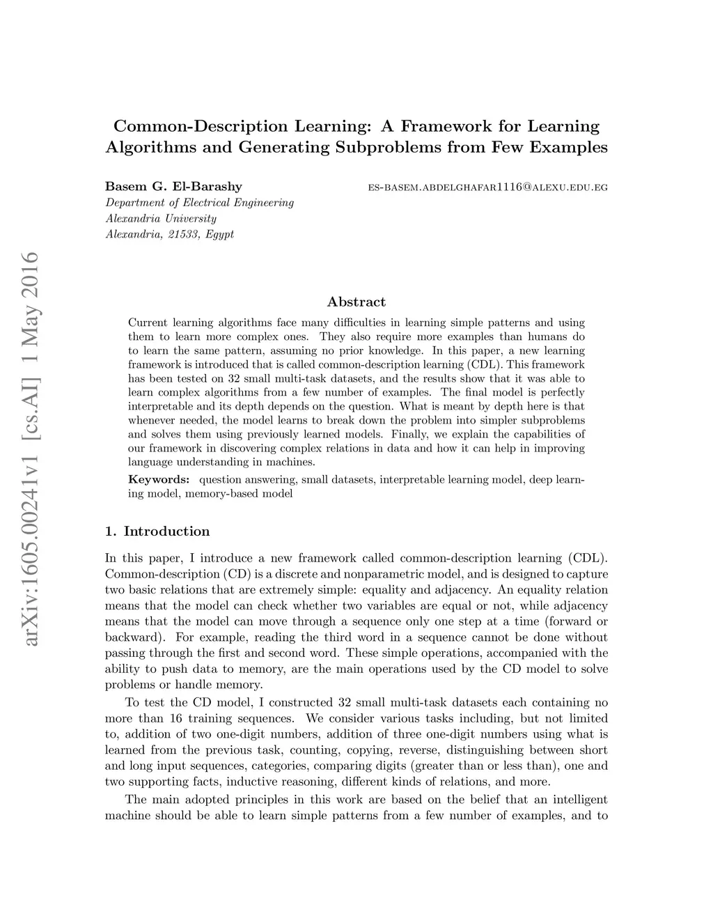 Current learning algorithms face many difficulties in learning simple patterns and using them to learn more complex ones. They also require more examples than humans do to learn the same pattern, assuming no prior knowledge. In this paper, a new learning framework is introduced that is called common-description learning (CDL). This framework has been tested on 32 small multi-task datasets, and the results show that it was able to learn complex algorithms from a few number of examples. The final model is perfectly interpretable and its depth depends on the question. What is meant by depth here is that whenever needed, the model learns to break down the problem into simpler subproblems and solves them using previously learned models. Finally, we explain the capabilities of our framework in discovering complex relations in data and how it can help in improving language understanding in machines.