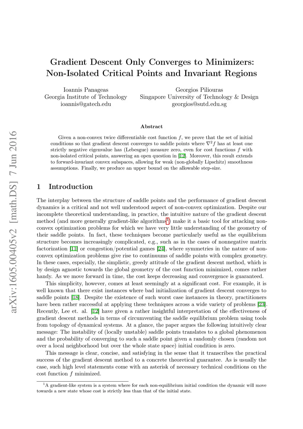 Given a non-convex twice differentiable cost function f, we prove that the set of initial conditions so that gradient descent converges to saddle points where \nabla^2 f has at least one strictly negative eigenvalue has (Lebesgue) measure zero, even for cost functions f with non-isolated critical points, answering an open question in [Lee, Simchowitz, Jordan, Recht, COLT2016]. Moreover, this result extends to forward-invariant convex subspaces, allowing for weak (non-globally Lipschitz) smoothness assumptions. Finally, we produce an upper bound on the allowable step-size.