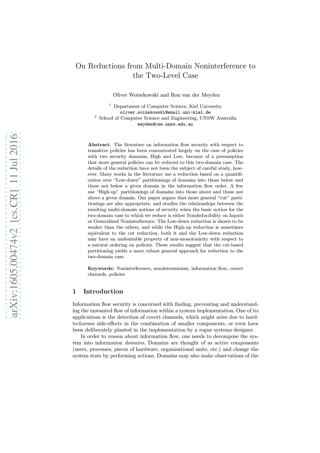 The literature on information flow security with respect to transitive policies has been concentrated largely on the case of policies with two security domains, High and Low, because of a presumption that more general policies can be reduced to this two-domain case. The details of the reduction have not been the subject of careful study, however. Many works in the literature use a reduction based on a quantification over "Low-down" partitionings of domains into those below and those not below a given domain in the information flow order. A few use "High-up" partitionings of domains into those above and those not above a given domain. Our paper argues that more general "cut" partitionings are also appropriate, and studies the relationships between the resulting multi-domain notions of security when the basic notion for the two-domain case to which we reduce is either Nondeducibility on Inputs or Generalized Noninterference. The Low-down reduction is shown to be weaker than the others, and while the High-up reduction is sometimes equivalent to the cut reduction, both it and the Low-down reduction may have an undesirable property of non-monotonicity with respect to a natural ordering on policies. These results suggest that the cut-based partitioning yields a more robust general approach for reduction to the two-domain case.