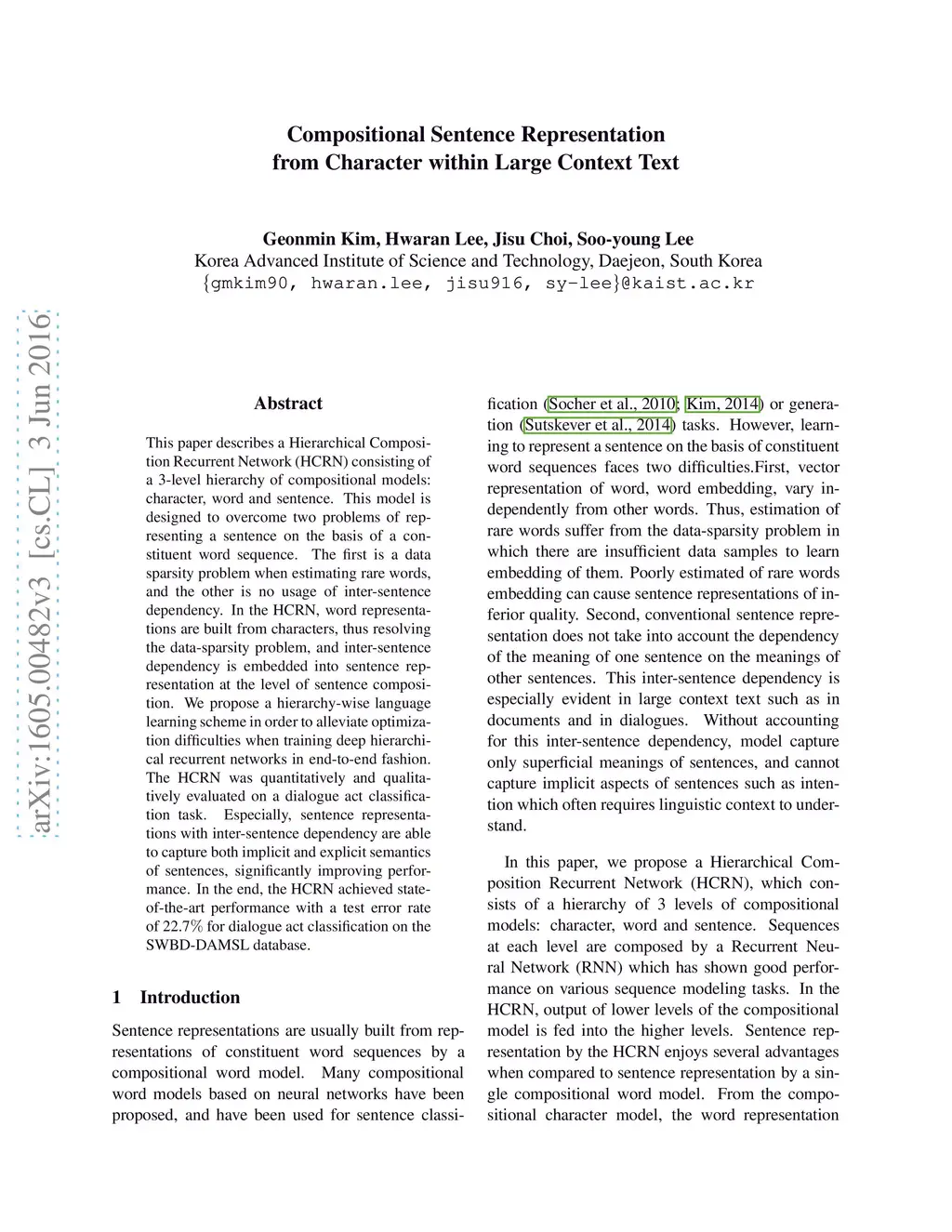 This paper describes a Hierarchical Composition Recurrent Network (HCRN) consisting of a 3-level hierarchy of compositional models: character, word and sentence. This model is designed to overcome two problems of representing a sentence on the basis of a constituent word sequence. The first is a data-sparsity problem in word embedding, and the other is a no usage of inter-sentence dependency. In the HCRN, word representations are built from characters, thus resolving the data-sparsity problem, and inter-sentence dependency is embedded into sentence representation at the level of sentence composition. We adopt a hierarchy-wise learning scheme in order to alleviate the optimization difficulties of learning deep hierarchical recurrent network in end-to-end fashion. The HCRN was quantitatively and qualitatively evaluated on a dialogue act classification task. Especially, sentence representations with an inter-sentence dependency are able to capture both implicit and explicit semantics of sentence, significantly improving performance. In the end, the HCRN achieved state-of-the-art performance with a test error rate of 22.7% for dialogue act classification on the SWBD-DAMSL database.