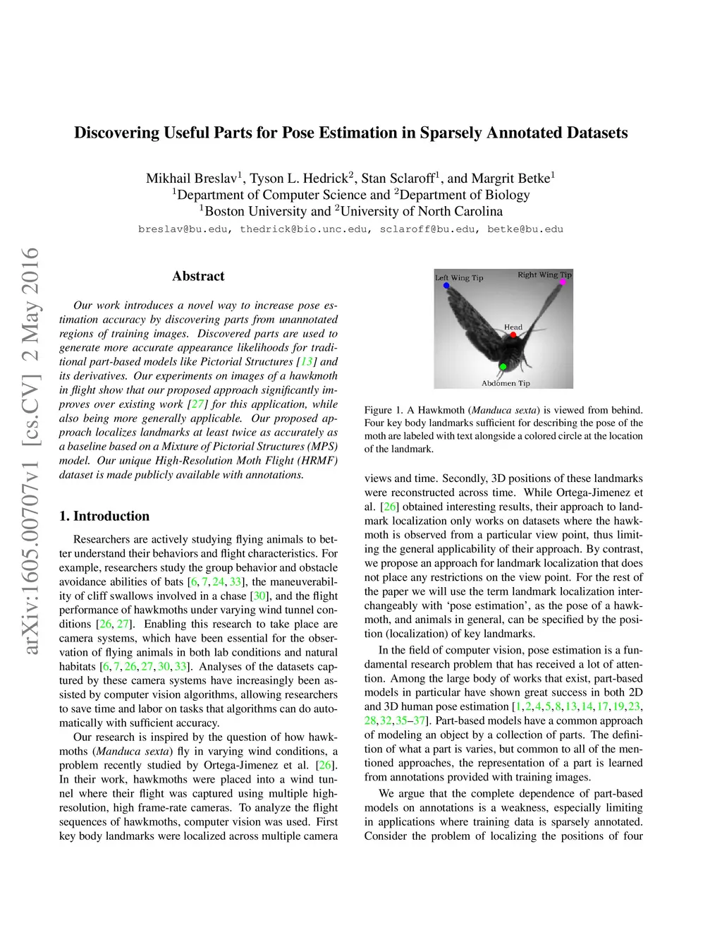Our work introduces a novel way to increase pose estimation accuracy by discovering parts from unannotated regions of training images. Discovered parts are used to generate more accurate appearance likelihoods for traditional part-based models like Pictorial Structures [13] and its derivatives. Our experiments on images of a hawkmoth in flight show that our proposed approach significantly improves over existing work [27] for this application, while also being more generally applicable. Our proposed approach localizes landmarks at least twice as accurately as a baseline based on a Mixture of Pictorial Structures (MPS) model. Our unique High-Resolution Moth Flight (HRMF) dataset is made publicly available with annotations.