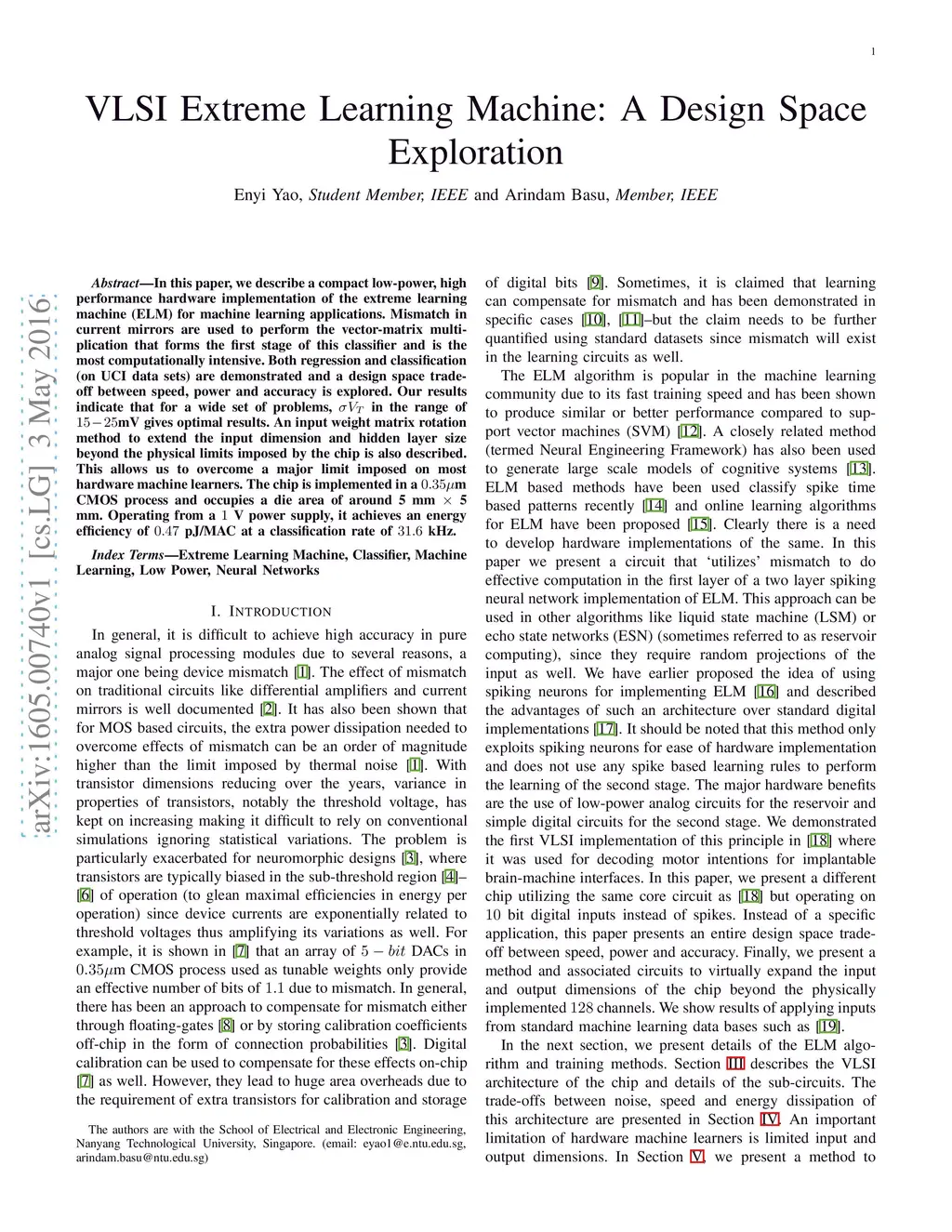 In this paper, we describe a compact low-power, high performance hardware implementation of the extreme learning machine (ELM) for machine learning applications. Mismatch in current mirrors are used to perform the vector-matrix multiplication that forms the first stage of this classifier and is the most computationally intensive. Both regression and classification (on UCI data sets) are demonstrated and a design space trade-off between speed, power and accuracy is explored. Our results indicate that for a wide set of problems, in the range of mV gives optimal results. An input weight matrix rotation method to extend the input dimension and hidden layer size beyond the physical limits imposed by the chip is also described. This allows us to overcome a major limit imposed on most hardware machine learners. The chip is implemented in a m CMOS process and occupies a die area of around 5 mm 5 mm. Operating from a V power supply, it achieves an energy efficiency of pJ/MAC at a classification rate of kHz.