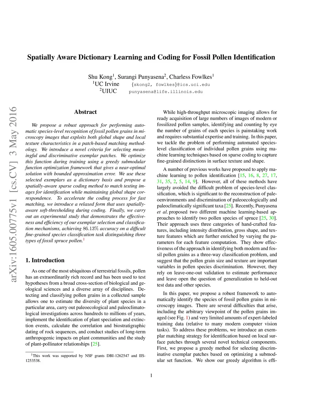 We propose a robust approach for performing automatic species-level recognition of fossil pollen grains in microscopy images that exploits both global shape and local texture characteristics in a patch-based matching methodology. We introduce a novel criteria for selecting meaningful and discriminative exemplar patches. We optimize this function during training using a greedy submodular function optimization framework that gives a near-optimal solution with bounded approximation error. We use these selected exemplars as a dictionary basis and propose a spatially-aware sparse coding method to match testing images for identification while maintaining global shape correspondence. To accelerate the coding process for fast matching, we introduce a relaxed form that uses spatially-aware soft-thresholding during coding. Finally, we carry out an experimental study that demonstrates the effectiveness and efficiency of our exemplar selection and classification mechanisms, achieving accuracy on a difficult fine-grained species classification task distinguishing three types of fossil spruce pollen.