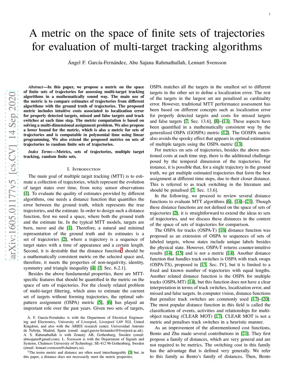 In this paper, we propose a metric on the space of finite sets of trajectories for assessing multi-target tracking algorithms in a mathematically sound way. The main use of the metric is to compare estimates of trajectories from different algorithms with the ground truth of trajectories. The proposed metric includes intuitive costs associated to localization error for properly detected targets, missed and false targets and track switches at each time step. The metric computation is based on solving a multi-dimensional assignment problem. We also propose a lower bound for the metric, which is also a metric for sets of trajectories and is computable in polynomial time using linear programming. We also extend the proposed metrics on sets of trajectories to random finite sets of trajectories.