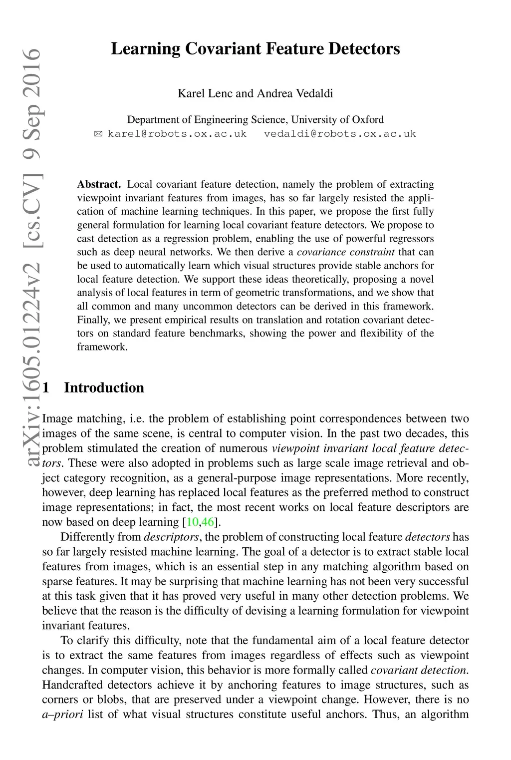 Local covariant feature detection, namely the problem of extracting viewpoint invariant features from images, has so far largely resisted the application of machine learning techniques. In this paper, we propose the first fully general formulation for learning local covariant feature detectors. We propose to cast detection as a regression problem, enabling the use of powerful regressors such as deep neural networks. We then derive a covariance constraint that can be used to automatically learn which visual structures provide stable anchors for local feature detection. We support these ideas theoretically, proposing a novel analysis of local features in term of geometric transformations, and we show that all common and many uncommon detectors can be derived in this framework. Finally, we present empirical results on translation and rotation covariant detectors on standard feature benchmarks, showing the power and flexibility of the framework.