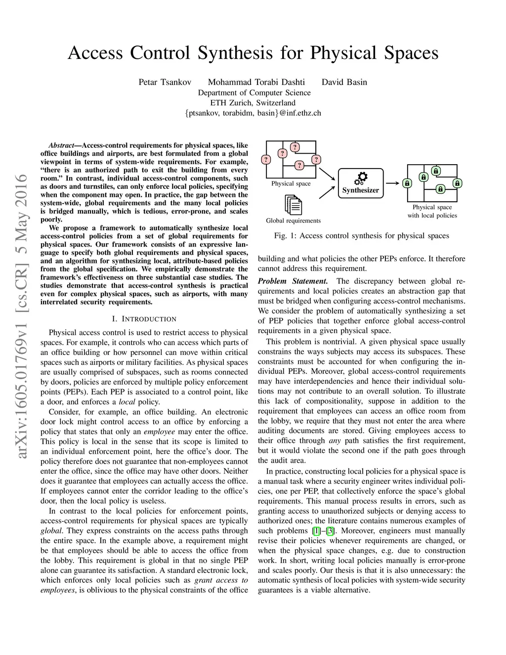 Access-control requirements for physical spaces, like office buildings and airports, are best formulated from a global viewpoint in terms of system-wide requirements. For example, "there is an authorized path to exit the building from every room." In contrast, individual access-control components, such as doors and turnstiles, can only enforce local policies, specifying when the component may open. In practice, the gap between the system-wide, global requirements and the many local policies is bridged manually, which is tedious, error-prone, and scales poorly. We propose a framework to automatically synthesize local access control policies from a set of global requirements for physical spaces. Our framework consists of an expressive language to specify both global requirements and physical spaces, and an algorithm for synthesizing local, attribute-based policies from the global specification. We empirically demonstrate the framework's effectiveness on three substantial case studies. The studies demonstrate that access control synthesis is practical even for complex physical spaces, such as airports, with many interrelated security requirements.