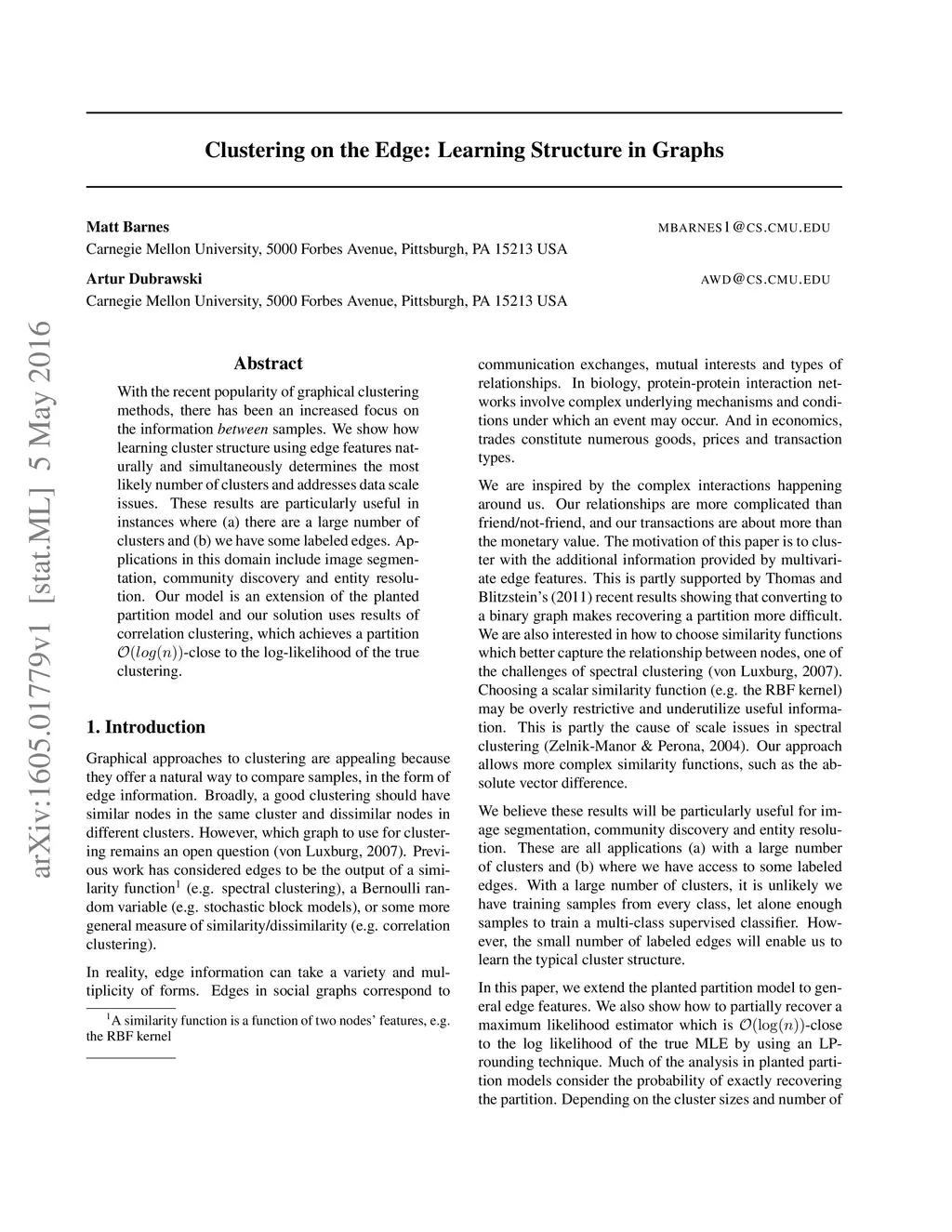 With the recent popularity of graphical clustering methods, there has been an increased focus on the information between samples. We show how learning cluster structure using edge features naturally and simultaneously determines the most likely number of clusters and addresses data scale issues. These results are particularly useful in instances where (a) there are a large number of clusters and (b) we have some labeled edges. Applications in this domain include image segmentation, community discovery and entity resolution. Our model is an extension of the planted partition model and our solution uses results of correlation clustering, which achieves a partition O(log(n))-close to the log-likelihood of the true clustering.