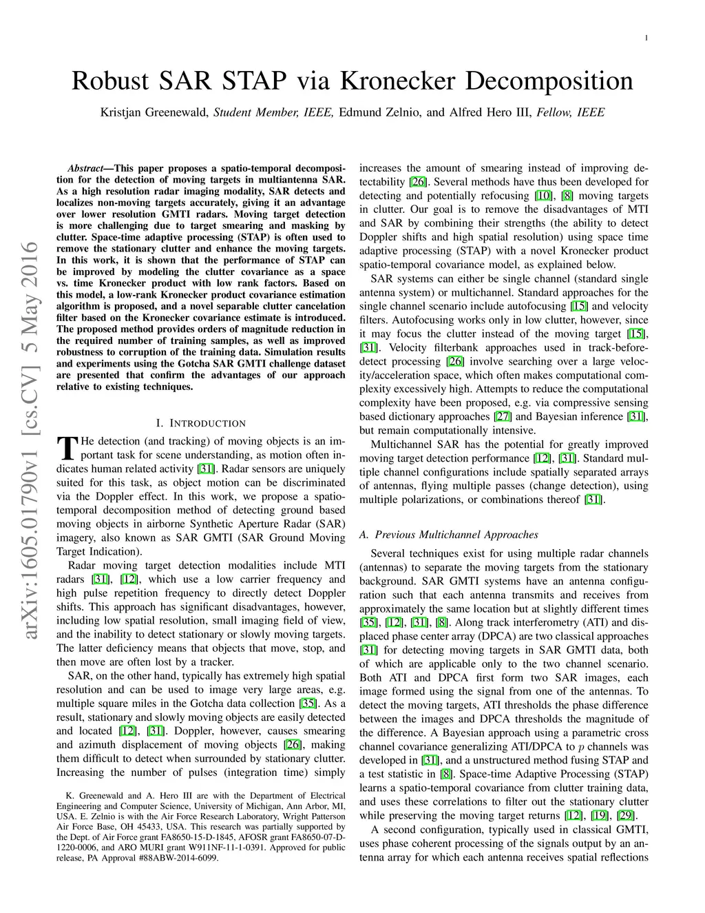This paper proposes a spatio-temporal decomposition for the detection of moving targets in multiantenna SAR. As a high resolution radar imaging modality, SAR detects and localizes non-moving targets accurately, giving it an advantage over lower resolution GMTI radars. Moving target detection is more challenging due to target smearing and masking by clutter. Space-time adaptive processing (STAP) is often used to remove the stationary clutter and enhance the moving targets. In this work, it is shown that the performance of STAP can be improved by modeling the clutter covariance as a space vs. time Kronecker product with low rank factors. Based on this model, a low-rank Kronecker product covariance estimation algorithm is proposed, and a novel separable clutter cancelation filter based on the Kronecker covariance estimate is introduced. The proposed method provides orders of magnitude reduction in the required number of training samples, as well as improved robustness to corruption of the training data. Simulation results and experiments using the Gotcha SAR GMTI challenge dataset are presented that confirm the advantages of our approach relative to existing techniques.