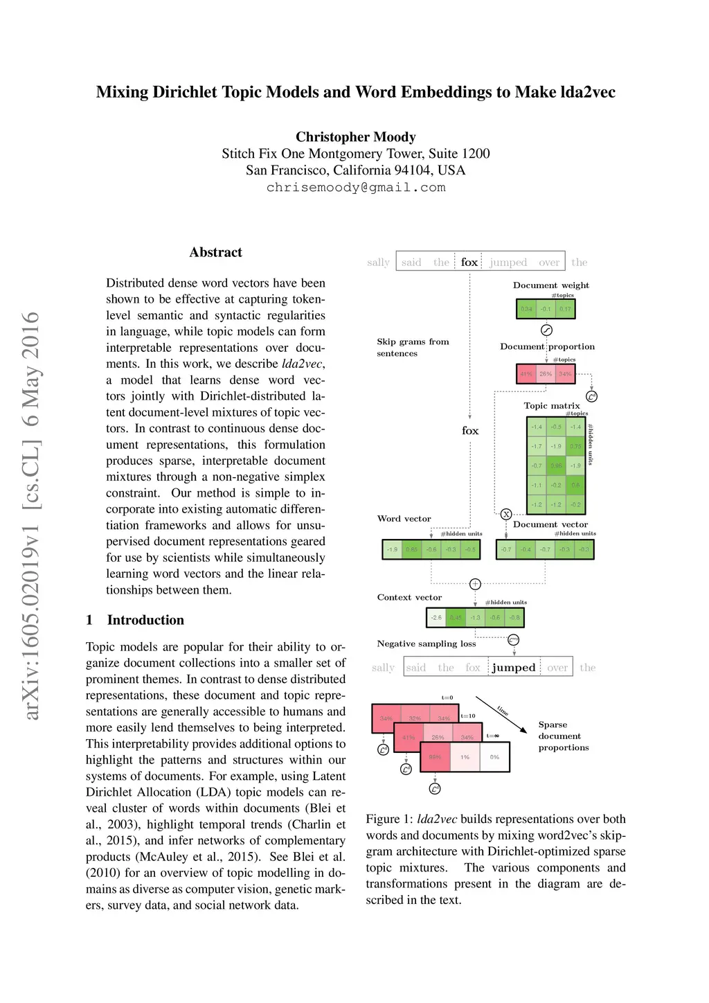 Distributed dense word vectors have been shown to be effective at capturing token-level semantic and syntactic regularities in language, while topic models can form interpretable representations over documents. In this work, we describe lda2vec, a model that learns dense word vectors jointly with Dirichlet-distributed latent document-level mixtures of topic vectors. In contrast to continuous dense document representations, this formulation produces sparse, interpretable document mixtures through a non-negative simplex constraint. Our method is simple to incorporate into existing automatic differentiation frameworks and allows for unsupervised document representations geared for use by scientists while simultaneously learning word vectors and the linear relationships between them.