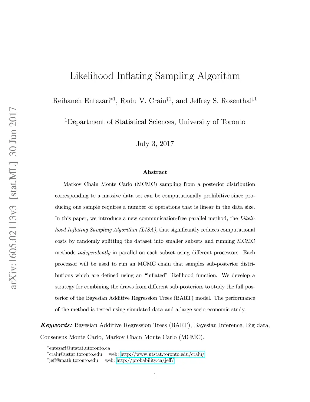 Markov Chain Monte Carlo (MCMC) sampling from a posterior distribution corresponding to a massive data set can be computationally prohibitive since producing one sample requires a number of operations that is linear in the data size. In this paper, we introduce a new communication-free parallel method, the Likelihood Inflating Sampling Algorithm (LISA), that significantly reduces computational costs by randomly splitting the dataset into smaller subsets and running MCMC methods independently in parallel on each subset using different processors. Each processor will be used to run an MCMC chain that samples sub-posterior distributions which are defined using an "inflated" likelihood function. We develop a strategy for combining the draws from different sub-posteriors to study the full posterior of the Bayesian Additive Regression Trees (BART) model. The performance of the method is tested using both simulated and real data.