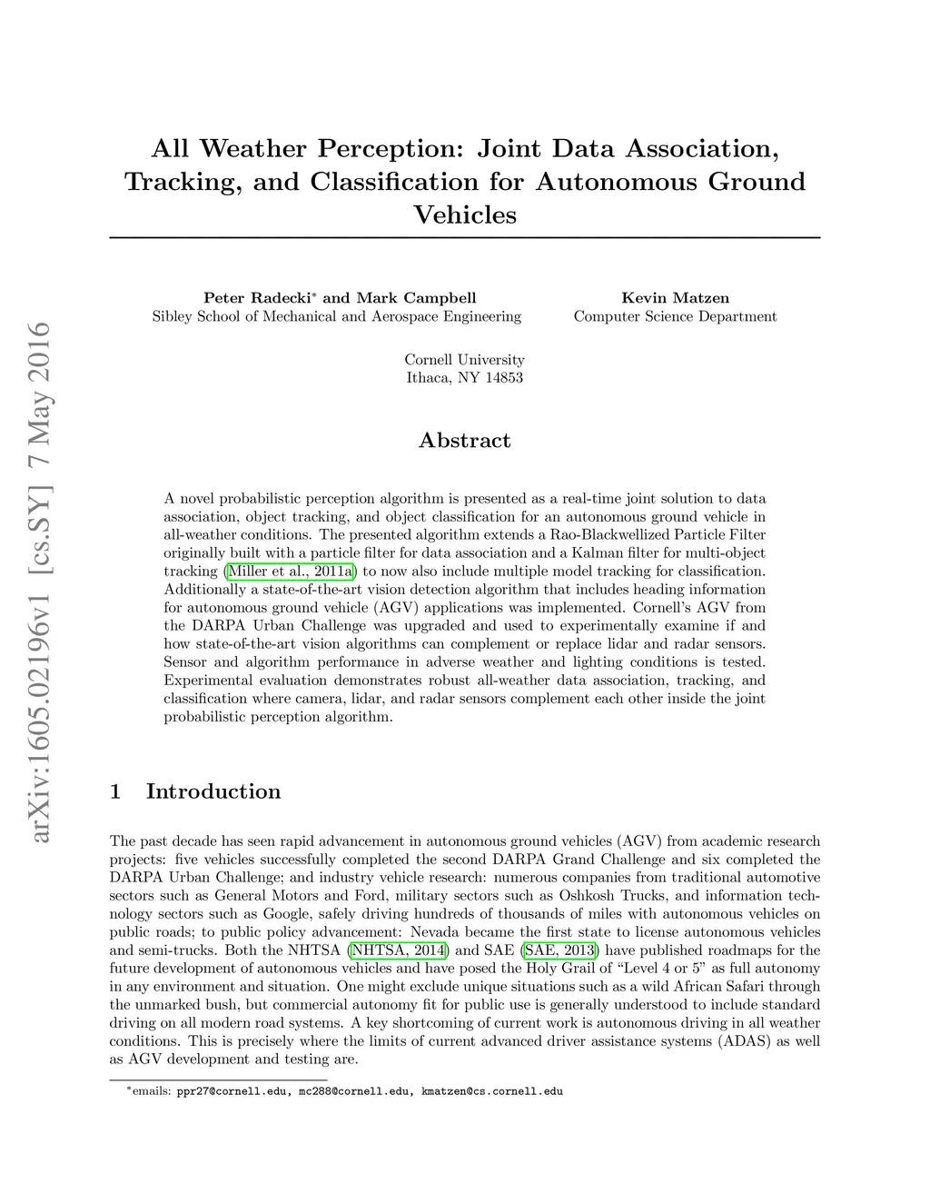 A novel probabilistic perception algorithm is presented as a real-time joint solution to data association, object tracking, and object classification for an autonomous ground vehicle in all-weather conditions. The presented algorithm extends a Rao-Blackwellized Particle Filter originally built with a particle filter for data association and a Kalman filter for multi-object tracking (Miller et al. 2011a) to now also include multiple model tracking for classification. Additionally a state-of-the-art vision detection algorithm that includes heading information for autonomous ground vehicle (AGV) applications was implemented. Cornell's AGV from the DARPA Urban Challenge was upgraded and used to experimentally examine if and how state-of-the-art vision algorithms can complement or replace lidar and radar sensors. Sensor and algorithm performance in adverse weather and lighting conditions is tested. Experimental evaluation demonstrates robust all-weather data association, tracking, and classification where camera, lidar, and radar sensors complement each other inside the joint probabilistic perception algorithm.
