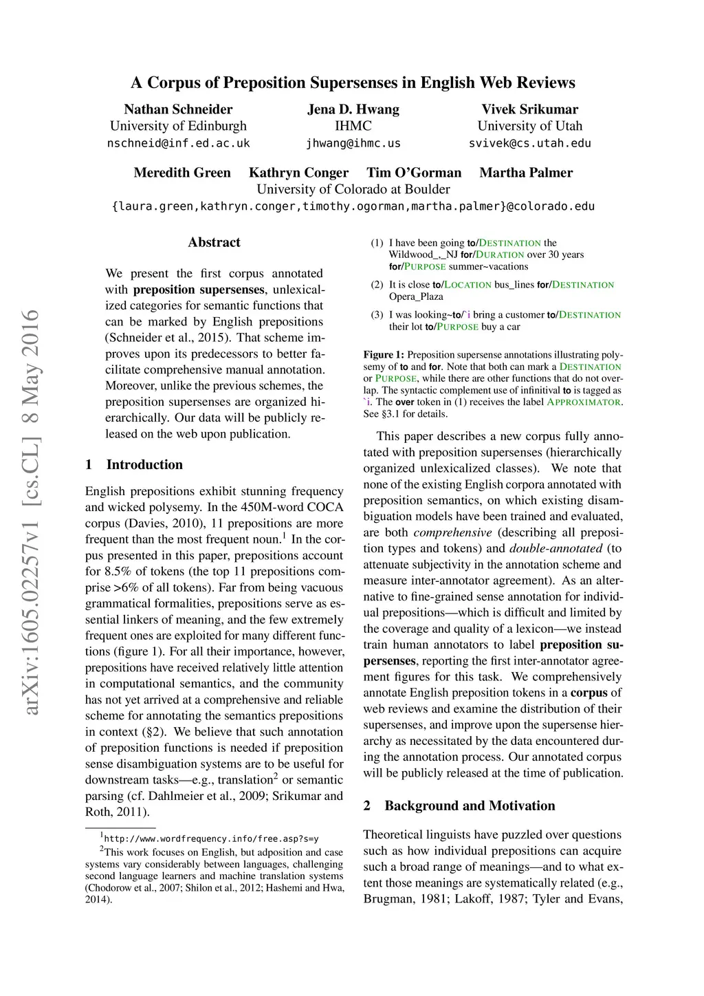 We present the first corpus annotated with preposition supersenses, unlexicalized categories for semantic functions that can be marked by English prepositions (Schneider et al., 2015). That scheme improves upon its predecessors to better facilitate comprehensive manual annotation. Moreover, unlike the previous schemes, the preposition supersenses are organized hierarchically. Our data will be publicly released on the web upon publication.