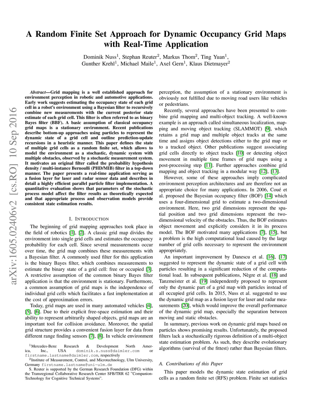 Grid mapping is a well established approach for environment perception in robotic and automotive applications. Early work suggests estimating the occupancy state of each grid cell in a robot's environment using a Bayesian filter to recursively combine new measurements with the current posterior state estimate of each grid cell. This filter is often referred to as binary Bayes filter (BBF). A basic assumption of classical occupancy grid maps is a stationary environment. Recent publications describe bottom-up approaches using particles to represent the dynamic state of a grid cell and outline prediction-update recursions in a heuristic manner. This paper defines the state of multiple grid cells as a random finite set, which allows to model the environment as a stochastic, dynamic system with multiple obstacles, observed by a stochastic measurement system. It motivates an original filter called the probability hypothesis density / multi-instance Bernoulli (PHD/MIB) filter in a top-down manner. The paper presents a real-time application serving as a fusion layer for laser and radar sensor data and describes in detail a highly efficient parallel particle filter implementation. A quantitative evaluation shows that parameters of the stochastic process model affect the filter results as theoretically expected and that appropriate process and observation models provide consistent state estimation results.