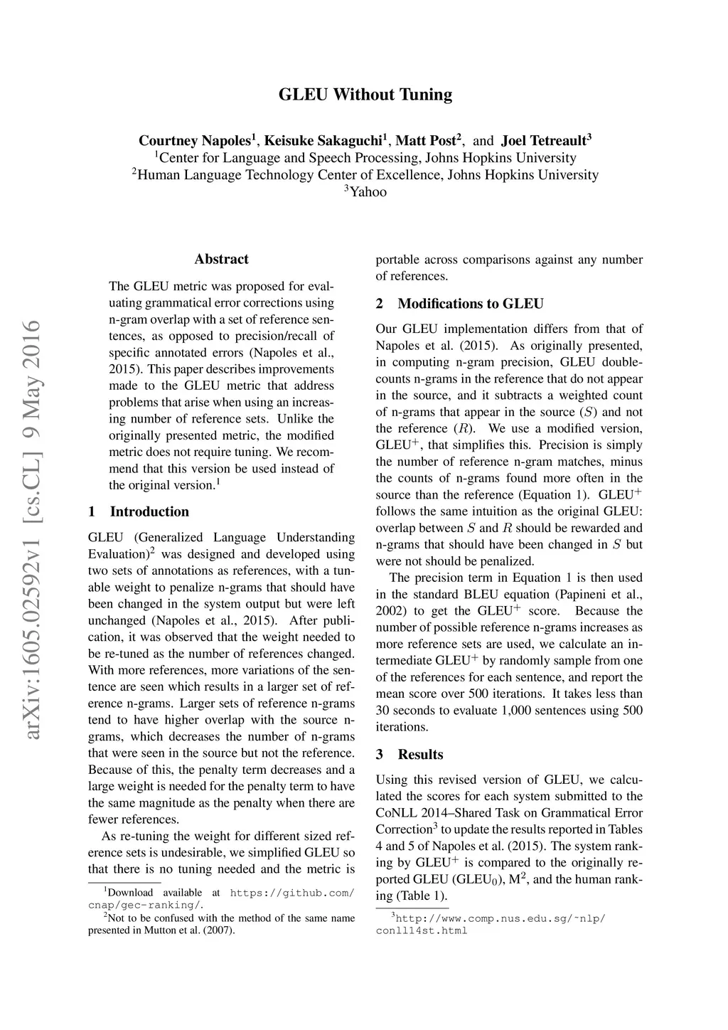 The GLEU metric was proposed for evaluating grammatical error corrections using n-gram overlap with a set of reference sentences, as opposed to precision/recall of specific annotated errors (Napoles et al., 2015). This paper describes improvements made to the GLEU metric that address problems that arise when using an increasing number of reference sets. Unlike the originally presented metric, the modified metric does not require tuning. We recommend that this version be used instead of the original version.
