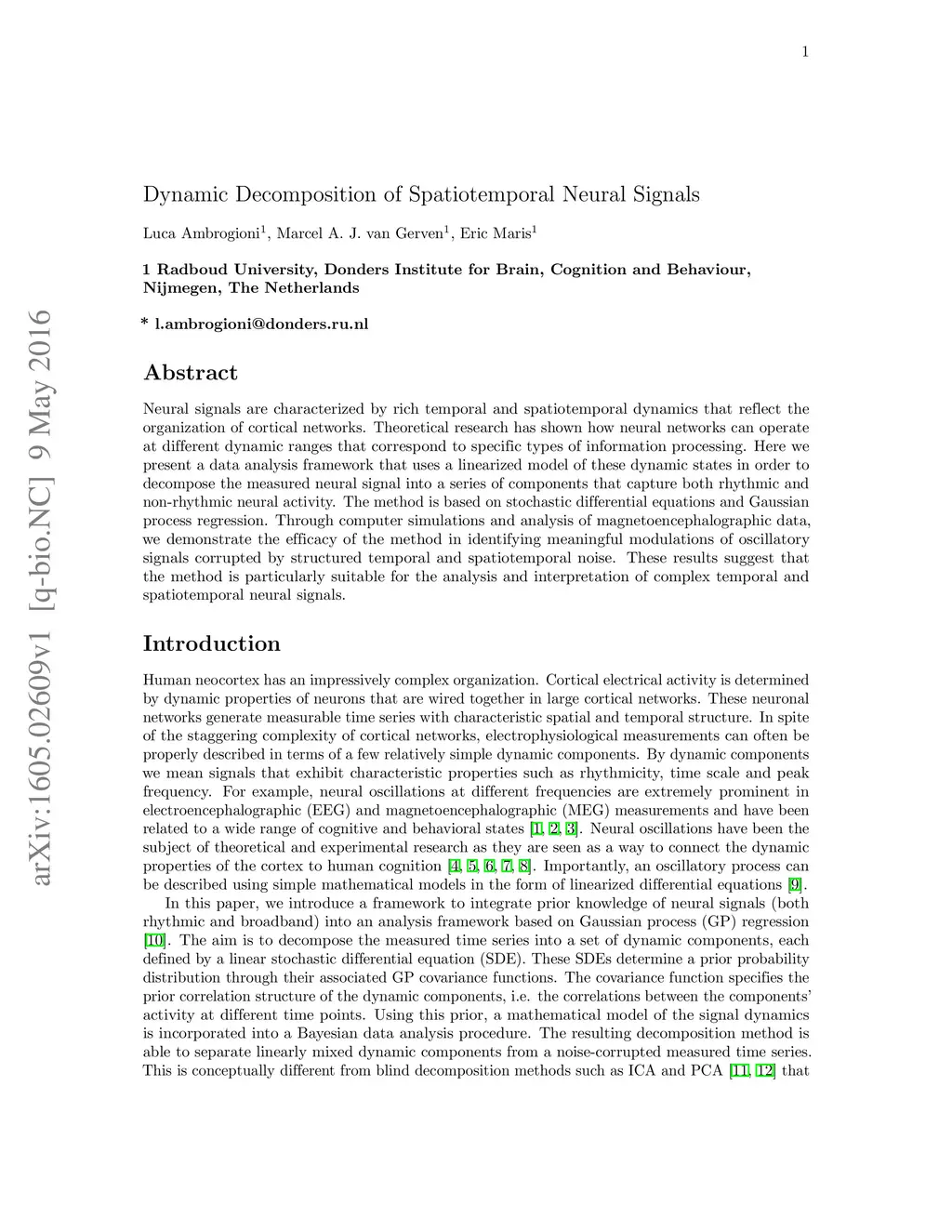 Neural signals are characterized by rich temporal and spatiotemporal dynamics that reflect the organization of cortical networks. Theoretical research has shown how neural networks can operate at different dynamic ranges that correspond to specific types of information processing. Here we present a data analysis framework that uses a linearized model of these dynamic states in order to decompose the measured neural signal into a series of components that capture both rhythmic and non-rhythmic neural activity. The method is based on stochastic differential equations and Gaussian process regression. Through computer simulations and analysis of magnetoencephalographic data, we demonstrate the efficacy of the method in identifying meaningful modulations of oscillatory signals corrupted by structured temporal and spatiotemporal noise. These results suggest that the method is particularly suitable for the analysis and interpretation of complex temporal and spatiotemporal neural signals.