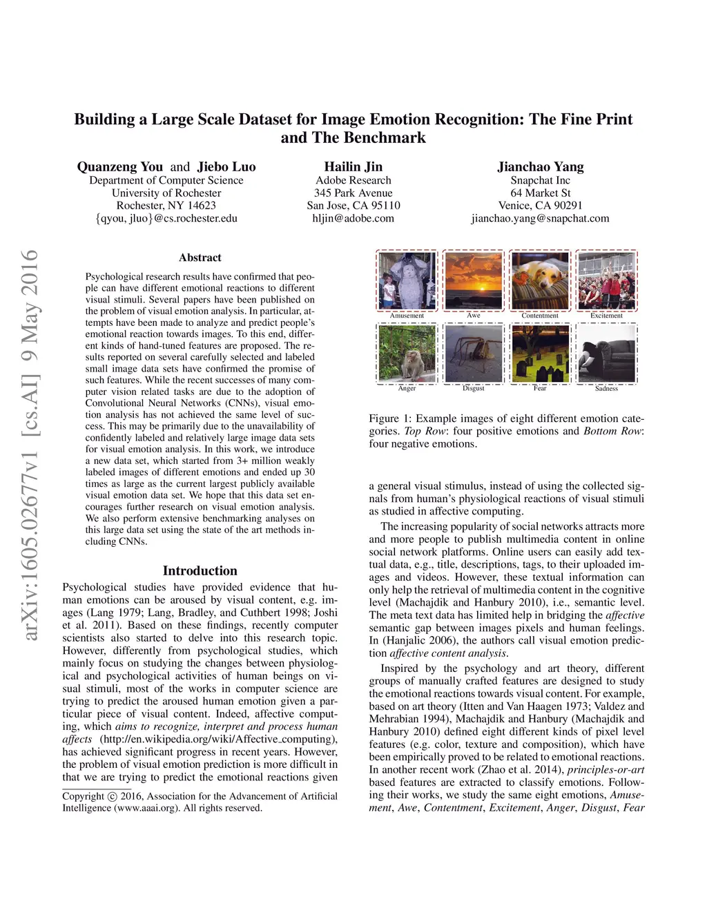Psychological research results have confirmed that people can have different emotional reactions to different visual stimuli. Several papers have been published on the problem of visual emotion analysis. In particular, attempts have been made to analyze and predict people's emotional reaction towards images. To this end, different kinds of hand-tuned features are proposed. The results reported on several carefully selected and labeled small image data sets have confirmed the promise of such features. While the recent successes of many computer vision related tasks are due to the adoption of Convolutional Neural Networks (CNNs), visual emotion analysis has not achieved the same level of success. This may be primarily due to the unavailability of confidently labeled and relatively large image data sets for visual emotion analysis. In this work, we introduce a new data set, which started from 3+ million weakly labeled images of different emotions and ended up 30 times as large as the current largest publicly available visual emotion data set. We hope that this data set encourages further research on visual emotion analysis. We also perform extensive benchmarking analyses on this large data set using the state of the art methods including CNNs.