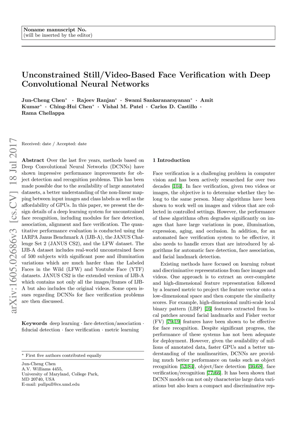 Over the last five years, methods based on Deep Convolutional Neural Networks (DCNNs) have shown impressive performance improvements for object detection and recognition problems. This has been made possible due to the availability of large annotated datasets, a better understanding of the non-linear mapping between input images and class labels as well as the affordability of GPUs. In this paper, we present the design details of a deep learning system for unconstrained face recognition, including modules for face detection, association, alignment and face verification. The quantitative performance evaluation is conducted using the IARPA Janus Benchmark A (IJB-A), the JANUS Challenge Set 2 (JANUS CS2), and the LFW dataset. The IJB-A dataset includes real-world unconstrained faces of 500 subjects with significant pose and illumination variations which are much harder than the Labeled Faces in the Wild (LFW) and Youtube Face (YTF) datasets. JANUS CS2 is the extended version of IJB-A which contains not only all the images/frames of IJB-A but also includes the original videos for evaluating the video-based face verification system. Some open issues regarding DCNNs for face verification problems are then discussed.